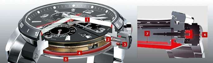 3. Dvojité těsnění v korunce 7. Šroubovací víčko hodinek s těsněním