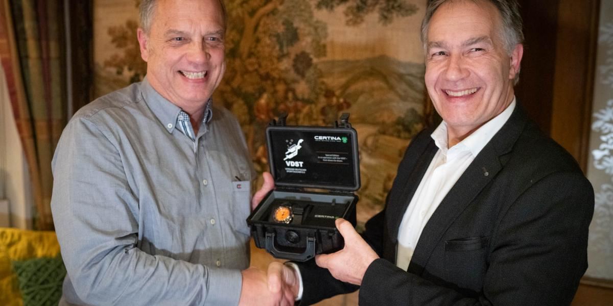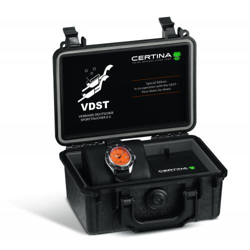 Hodinky jsou dodávané v černém kufříku s logem Certina a asociací potápěčů VDST.