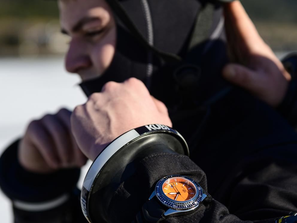 Model o velikosti 43mm má oranžový číselník se silnou luminiscencí SuperLuminova a strojek pak chrání safírové sklíčko s antireflexní úpravou odolné proti poškrábání. Několik vrstev z luminiscenčního materiálu poskytuje skvělou viditelnost ve vodě, zatímco šrobovací zadní víčko pouzdra a šroubovací korunka zajišťují vodotěsnost hodinek do 500 metrů.