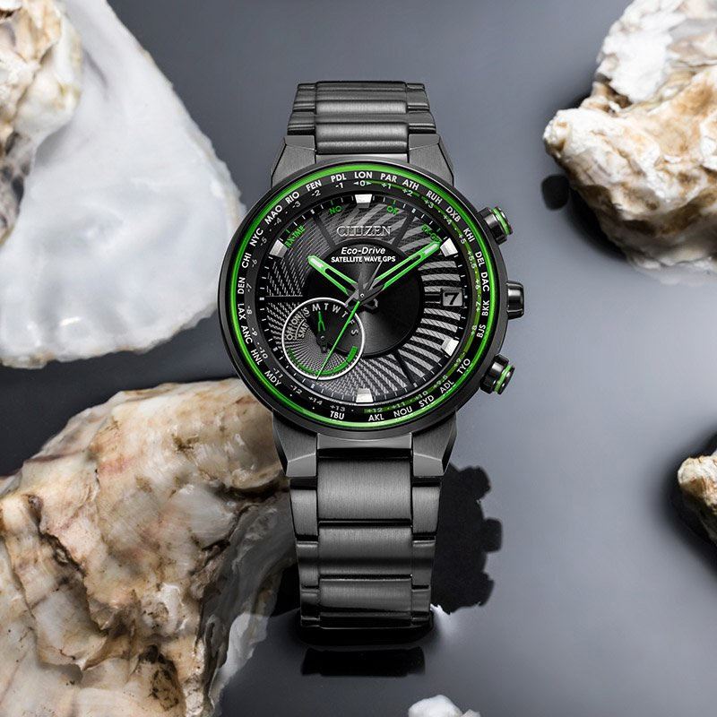 Černý číselník s jasně zelenými prvky je chráněn minerálním sklíčkem. Hodinky snesou velkou zátěž díky antimagnetickému provedení a funkcí pro detekci nárazu. Při extrémních teplotách dojde k automatickému zastavení nabíjení.