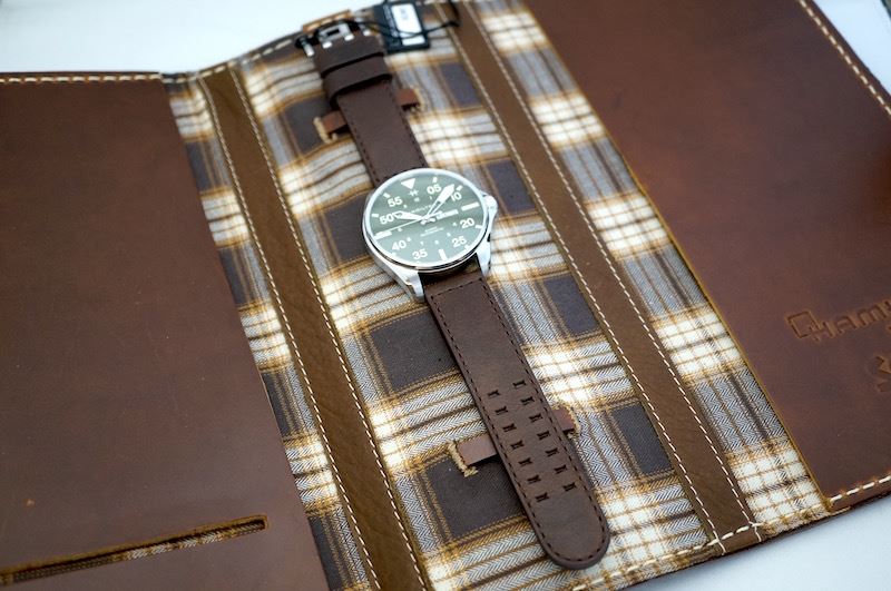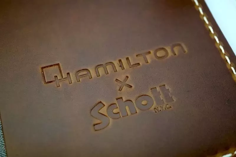 Díky značce Schott NYC je tento speciální model Khaki Aviation Pilot dodáván v koženém pouzdře vyrobeném výhradně touto oděvní značkou pro Hamilton. Pouzdro je šité ručně pomocí tradičních technik v továrně Schott NYC v Unionu v New Jersey. Skládací kožený box je potažen kostkovanou těžkou bavlněnou kartáčovanou bavlnou a má boční vstupní kapsy a držák na kartu pro cestování. Je také vyrobeno ze stejné kůže jako letové bundy během války a používá se dodnes.