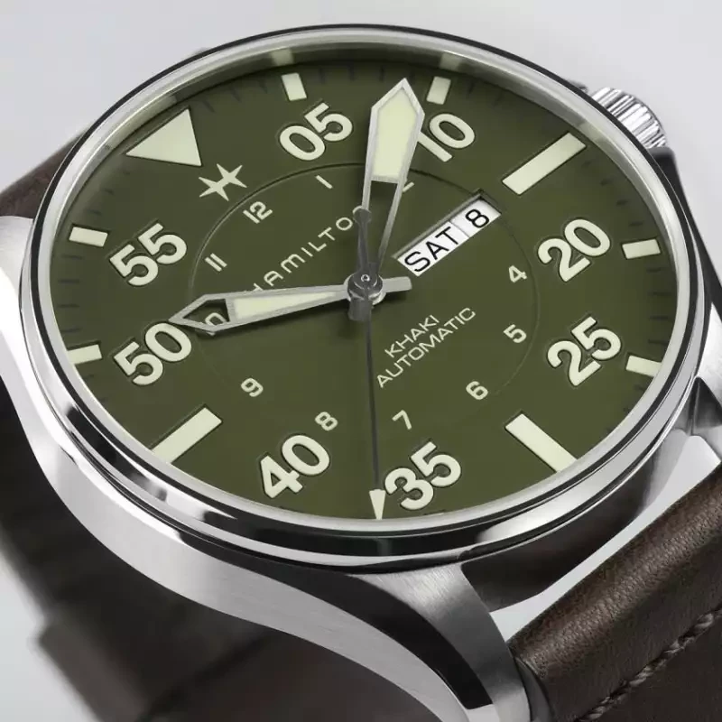 V modelu ve velikost 46mm se nachází automatický strojek swiss ETA s kalibrem H-30 vyráběným exkluzivně pro Hamilton s rezervou chodu 80 hodin a přesností 4-5 vteřin denně. Čas je zobrazen na khaki zeleném číselníku s kontrastními luminiscenčními ručkami. Důležitost čitelnosti pro piloty nelze podceňovat a právě díky luminiscenci Super-LumiNova je perfektní přehlednost a čitelnost na první pohled, dokonce i ve tmě.