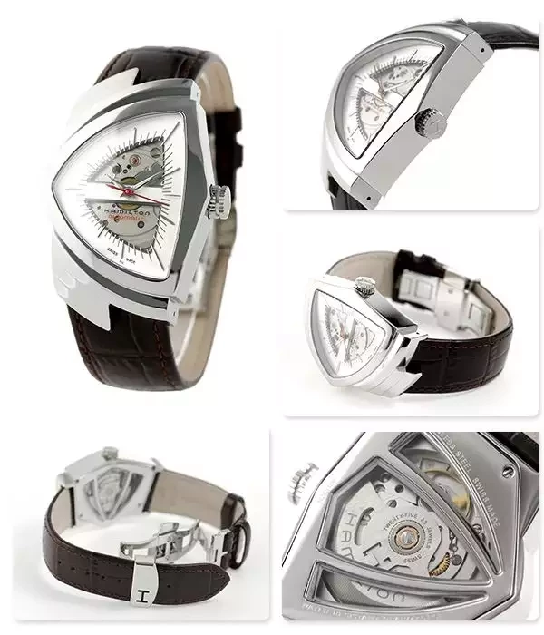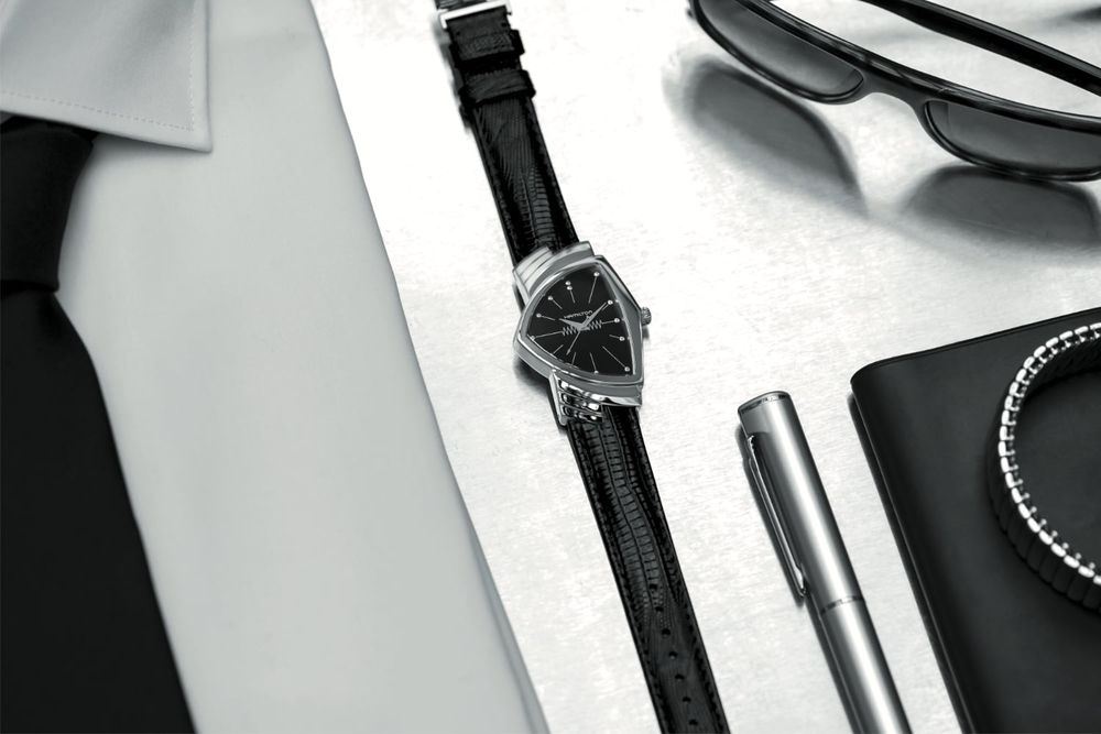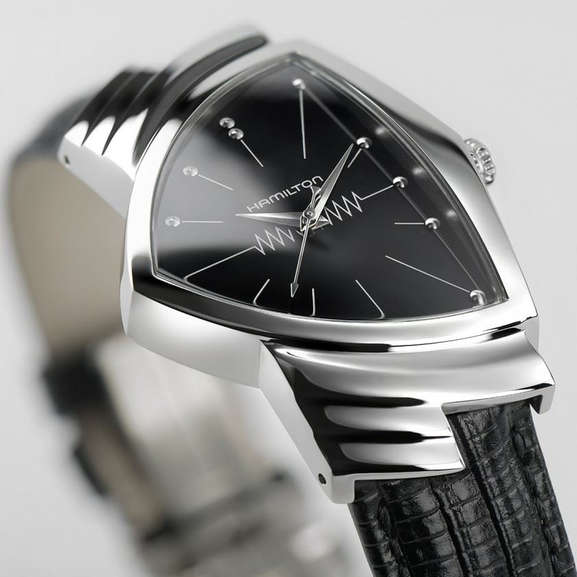 Hodinky této švýcarské značky se objevují na stříbrném plátně pravidelně již od roku 1932. Celkem je možné zahlédnout hodinky Hamilton na zápěstí nejrůznějších hrdinů ve více než pěti stech filmových trhácích. Historie řady Ventura sahá až do roku 1957, kdy se staly světově prvními elektrickými hodinkami, tedy časomírou s bateriovým strojkem. Elektrický pohon označuje i křivka střídavého proudu půlící číselník. Hodinky jsou lehko zapamatovatelné díky trojúhelníkovému tvaru pouzdra, i provedením ocelového náramku.