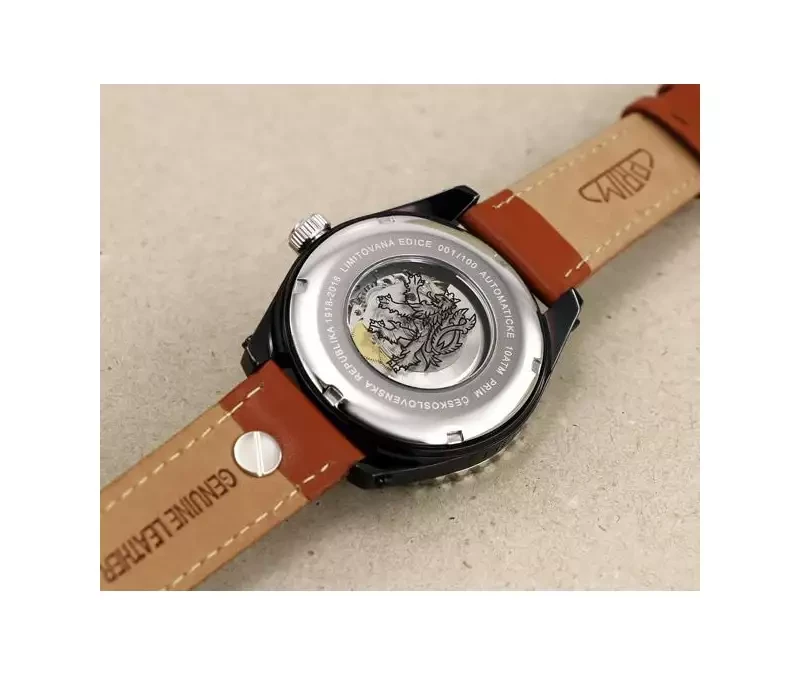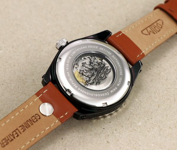 Na opačné straně je šroubovací korunka doplněná originálním symbolem Prim. Model je osazen originálními ručkami s luminiscenční vrstvou, která k tomuto modelu bezvýhradně patří. Tento model sportovních hodinek je označen a testován na 10ATM. Originální číselník se sportovními indexy chrání kvalitní safírové sklíčko. Hodinky jsou uzavřeny nerezovým víčkem s popisem limitované série a s průzorem doplněným originálním symbolem lva, tak aby zůstal zachován detail na pracují strojek hodinek. Hodinky jsou opatřeny speciálním koženým řemínkem se symbolem lva, který podtrhuje celkový význam 100. výročí.