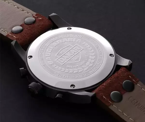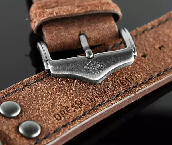 Hodinky jsou opatřeny kvalitním koženým řemínkem s jemným detailem, a to ražbou motta a loga, doplněnými dvěma cvoky a robustní sponou s logem Dakar 2020.