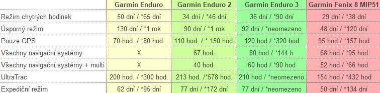 Enduro jedničky, představené v únoru 2021 jsou v podstatě Fénix 6X, mírně očesané o mapy a hudbu. Tedy položky, které se nejvíce zakusují do výdrže baterky. S optimalizovaným řízením spotřeby jste se pohodlně dostali na 80h sekundového GPS záznamu, v režimu ultratrac pak na 300h. Enduro dvojky spatřily světlo světa v srpnu 2022, a jsou postavené na bázi Fénix 7X. Až na pár marginalit byla similarita dokonalá, a tak zásadnější rozdíl hledejte pouze v designu. Mají zpět mapy a pro „enduří koncepci“ poněkud kontroverzní mp3, hudbu. V sekundovém GPS záznamu se s nimi dostali na 150h, v režimu ultratrac pak na teoretických 578h. Což je úctyhodné, ale stejné číslo jako má Fénix 7X.