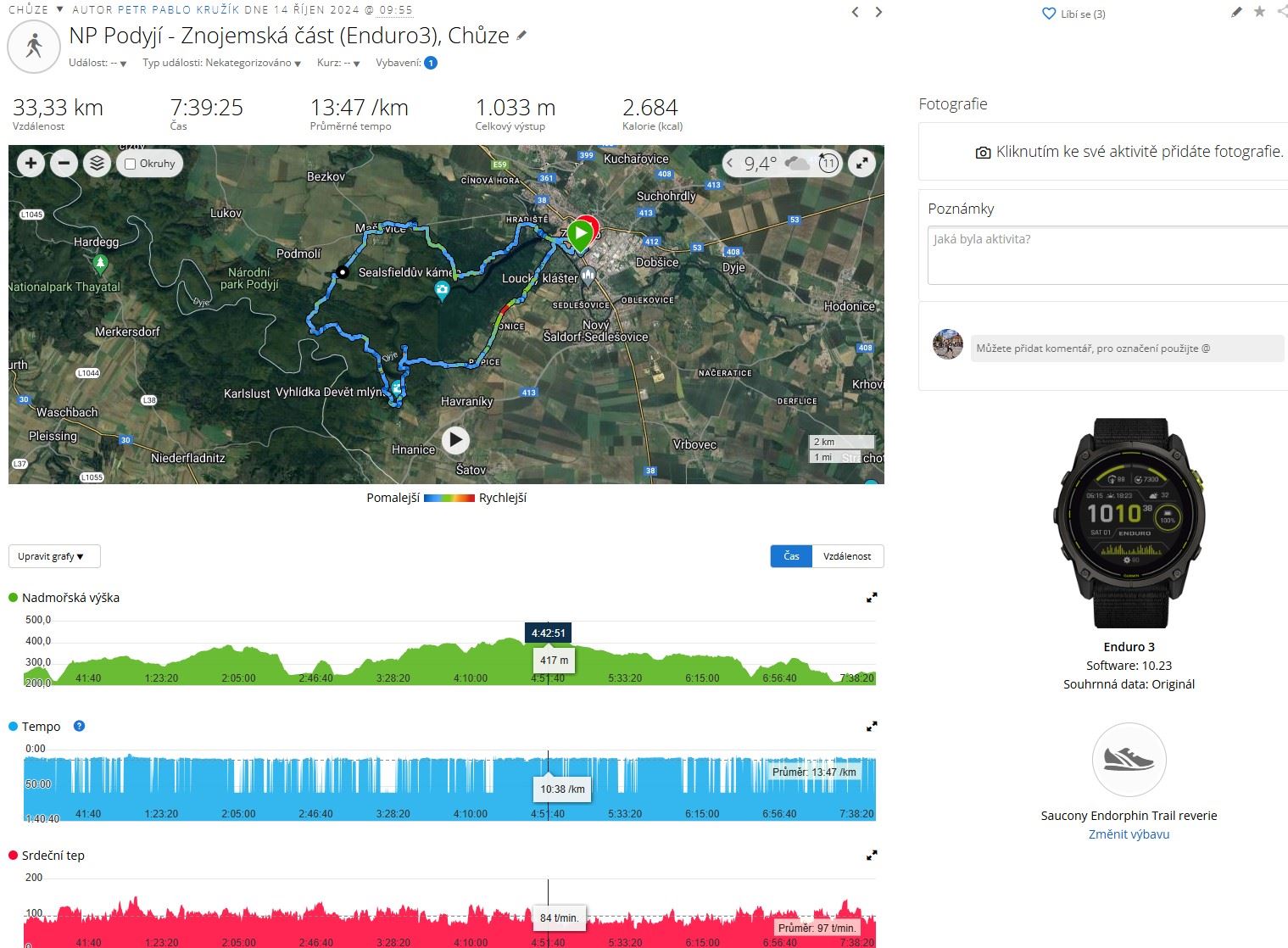 Výdrž baterky na GPS jsem prověřoval čtyřmi celodenními túrami v NP Podyjí a NPR Divoká Oslava a v divokém srdci řeky Jihlavy pod Mohelenskou hadcovou stepí. I když se může zdát, že jde člověk údolími řek, není to zdaleka pravda. Cesty jsou vedeny z údolí přes časté skalnaté vyhlídky, hrany jsou o 150m výše jak paty. Terén je přes různé menší či větší skalky, traverzy a v primárním kontaktu s řekou samozřejmě plný klouzajících kamenů. Typicky na Oslavě a tím spíše teď na barevný podzim. I tak uděláte 1000 výškových metrů jak prd. Moje vlastní body battery vždy došlo konce dříve, jak garminí Enduro battery. Vlastně jsem je za ten měsíc nabíjel jen dvakrát.
