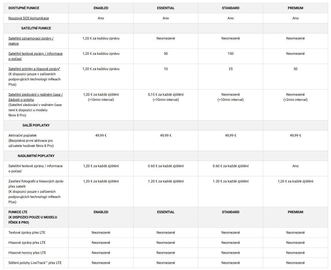 Dále... Vy, jako majitel hodinek s LTE konektivitou si budete muset zřídit předplatné InReach, bez toho se zkrátka nehnete. To nejlevnější bude stát pravděpodobně 9.99€ měsíčně. První aktivace a prvních 30 dní máte na vyzkoušení zdarma. Po té si ideálně zvolíte svůj tarif, neboť za doplňkové služby se samozřejmě platí. Druhá aktivace InReach je 49.99 Eur. Vše vidíte v přehledné tabulce převzaté ze serveru Garmin.cz
