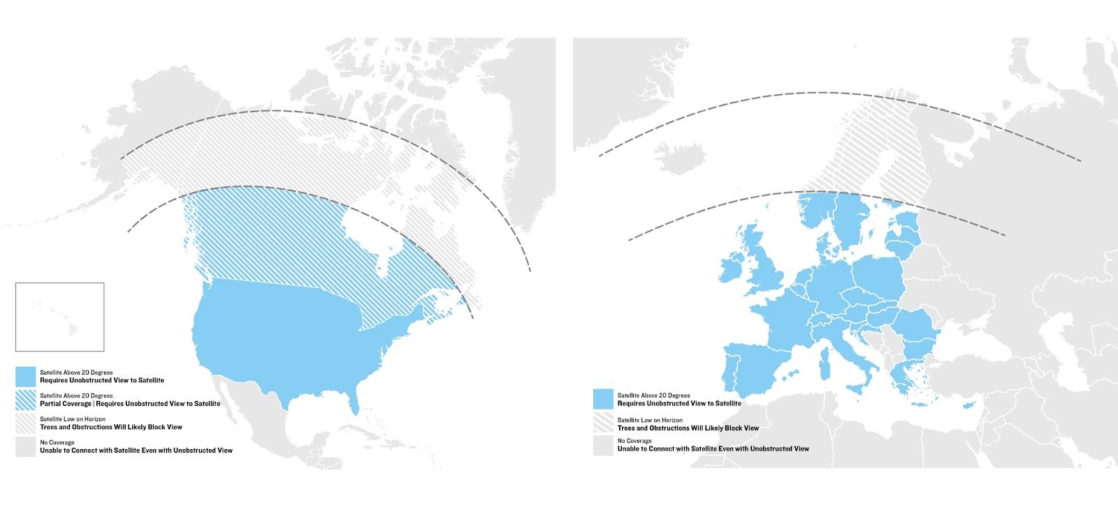 Satelitní pokrytí (Skylo) – Evropa a Severní Amerika. Vždy vyžaduje co nejméně překážek mezi hodinkami a oblohou.