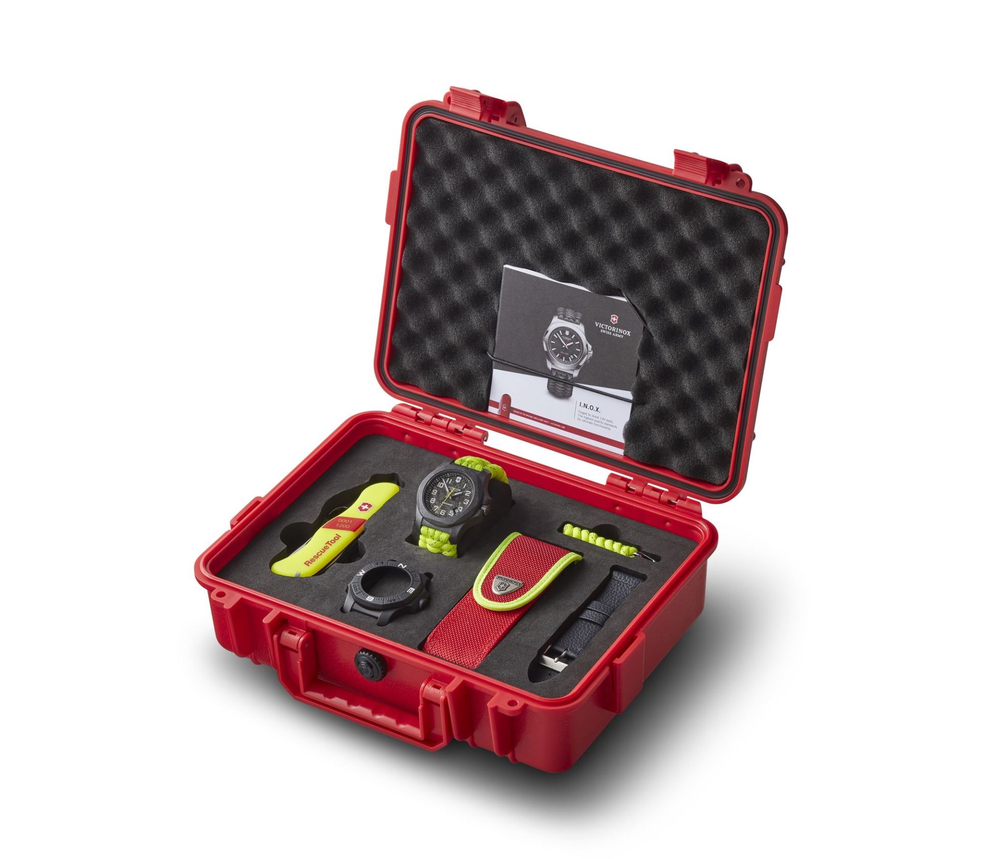 Součástí balení je náhradní kožený řemínek (vyrobený ze stejného materiálu jako boty pro hasiče), černý gumový ochranný kryt a očíslovaný kapesní nůž Victorinox Rescue Tool s pouzdrem.