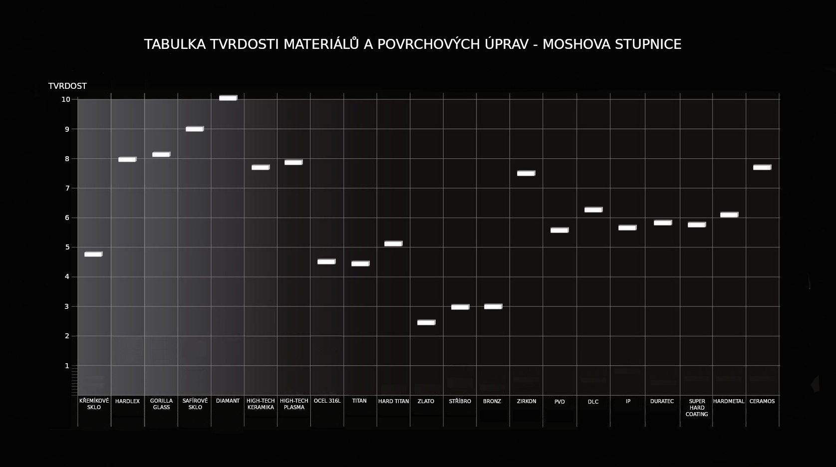Nejměkkčím materiálem na výrobu pouzder a náramků je hliník (aluminium) - ten je na tupnici tvrdosti Vickers u čísla 50 - 70 Vickers. Zlato je kov velmi měkký, avšak o něco tvrdší než hliník a na stupnici tvrdosti tak nacházíme tento drahý kov na postech 80 - 120 Vickers. Dalším, velmi starým materiálem používaným dnes na výrobu pouzder hodinek, je bronz - ten najdeme na stupnici tvrdosti u čísel 100 - 170 Vickers. Ušlechtilá nerez ocel 316L, která se používá na výrobu pouzder a náramků nejčastěji, následuje za bronzem (ocel je ve většině případech tvrdší a houževnatější než titanium) a svojí tvrdostí ho předčí - na stupnici vidíme ocel u čísel 160 - 690 Vickers (nejčastěji má ocel kolem 250 Vickers, ocel 904L má cca. 490 Vickers a více). U titanu záleží, jak je vyroben a v jaké tvrdosti - na stupnici tvrdosti se pohybuje mezi čísly 150 - 340 Vickers (dle legování materiálů může být ale v některých případech tvrdší než ocel). Až do této úrovně tvrdosti lze tyto materiály denním nošením poškrábat (dle užívání někdy sotva znatelné, jindy je nošení na hodinkách patrné více), ale na druhou stranu jej lze zase vyleštit (či namatovat atd. - dle povrchové úpravy) tak, že pouzdro i náramek vypadají jako nové. Další následuje materiál posazený v rozmezí 450 - 560 Vickers a to je minerální sklo a hned vedle o něco tvrdší je zrcadlová ocel s označením 904L (490 - 590 Vickers). Dalším materiálem, který se používá na výrobu pouzder a náramků, je High-tech Keramika, která je na stupnici tvrdosti v rozmezí 1.200 - 1.800 Vickers. Další následuje Hardmetal, který je posazen na 1.400 - 1.700 Vickers. Ceramos je směs keramiky a ocele a tvrdost tohoto materiálu je 1.400 - 1.900 Vickers. A ještě tvrdší než Ceramos je safírové sklo, které má 1.900 - 2.200 Vickers. Mezi nejtvrdší materiály patří diamant - ten je na stupnici na postu 10.000 Vickers. A nejtvrdším materiálem celkově je ACNR - tento materiál předčil tvrdostí i diamant.