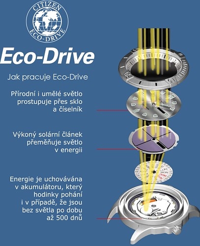 Eco-Drive není vlastní pohon hodinek, zde zajišťuje pohon pro hodinky akumulátor nebo kondenzátor - zjednodušeně řečeno baterie. Avšak tento akumulátor či kondenzátor (napájecí článek) má tu schopnost, že absorbuje přes zvláštní vrstvu v číselníku energii, kterou se dobíjí a je schopen se dobít až na 9 měsíců. A tato energie je brána ze světla - a to jak denního, tak umělého. Odpadá zde tedy výměna baterií, což je velmi praktické a zvyšuje to komfort pro každé hodinky tímto doplněné.
