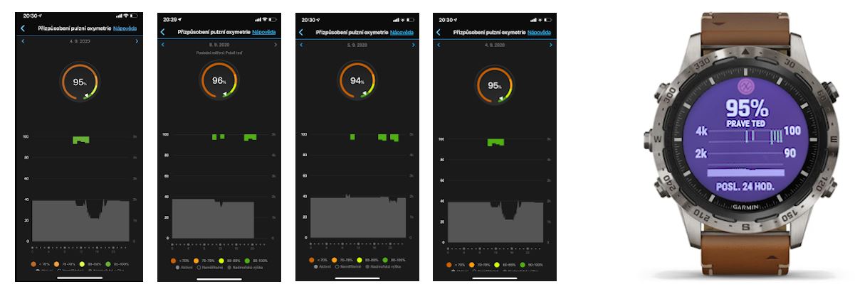 Pulsní oxymetr Vám měří nasycení Vaší krve kyslíkem. Normální hodnota je 95 - 99%. Tento procentuální ukazatel nám říká poměr kyslíku k hemoglobinu v krvi, jak kvalitně a rychle nám putuje kyslík do tkání. Princip základních měřáků spočívá v prosvícení krve např. zkrz prst. Hodinky Garmin využívají zase optické zpětné vazby od hemoglobinu. Dle vyčíslení v procentech máme přehled, kolik kyslíku se nám dostává do krve, resp. jak Vaše tělo absorbuje kyslík. Měření je závislé na mnoha faktorech, zejmén avšak na celkovém stavu Vašeho zdraví a kondice. Je-li Sp02 (tak se nazývá ve zkratce Saturace v končetinách těla) nižší než normál, je lepší si odpočinout a s tréninkem vůbec nezačínat. V hodinkách Garmin máme velmi citlivé snímače, které nám změří náš Sp02 velice přesně. Spojíme-li v hodinkách Garmin funkci Body Battery a Pulsní oxymetr, výsledek nám zřetelně ukazuje, jak máme připravené naše tělo na trénink. Ideálně jsme připraveni na trénink ve chvíli, kdy máme Body battery v plusových hodnotách a Sp02 97 - 99%. Pro podrobnější informace o dlouhodobějším stavu kyslíku ve Vašem těle a jeho absorbci si můžete aktivovat pulsní oxymetr přes noc. Na hodinkách Garmin si můžete nastavit Pulsní oxymetr do základního menu, takže si můžete měřit saturaci snadno a rychle. Data se automaticky synchronizují do chytrého telefonu, kde se v aplikaci Garmin Connect shromažďují a Vy pak můžete zpětně vyhodnocovat.