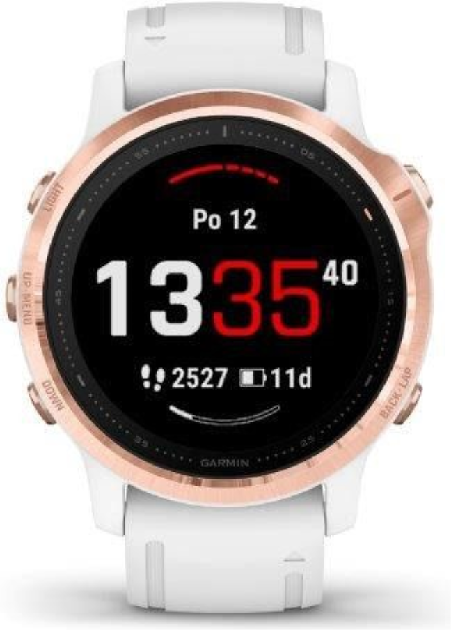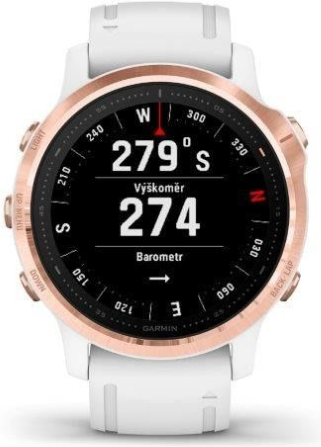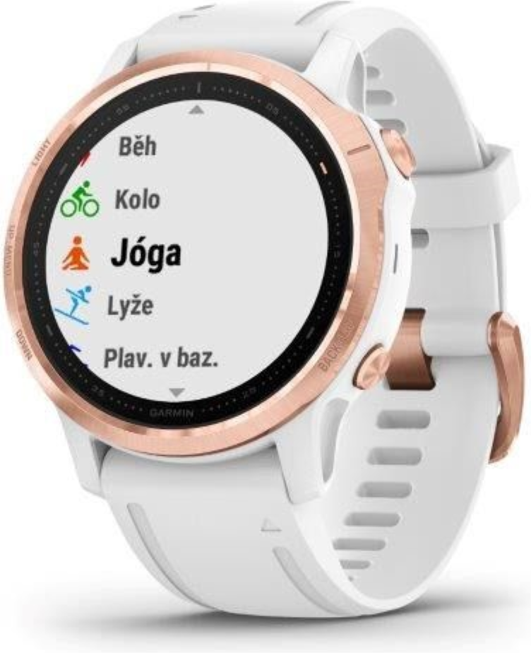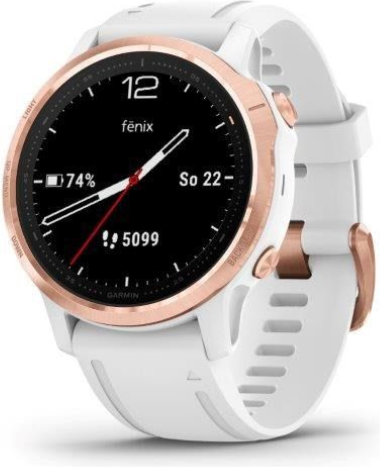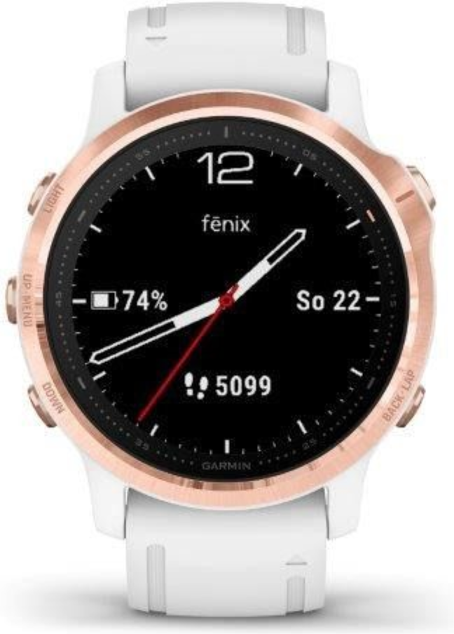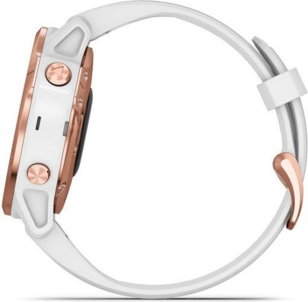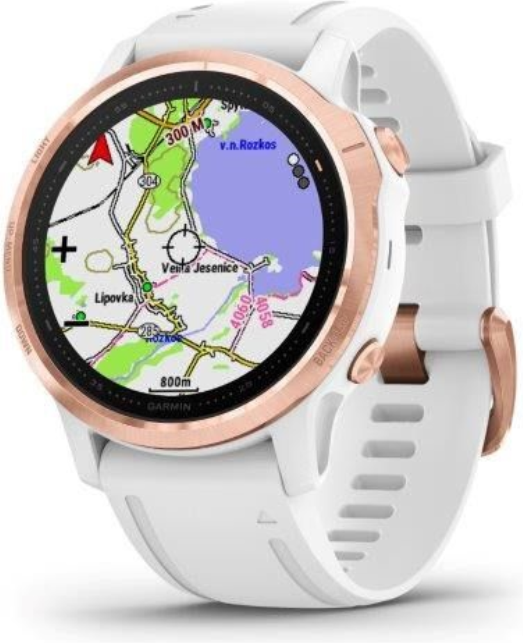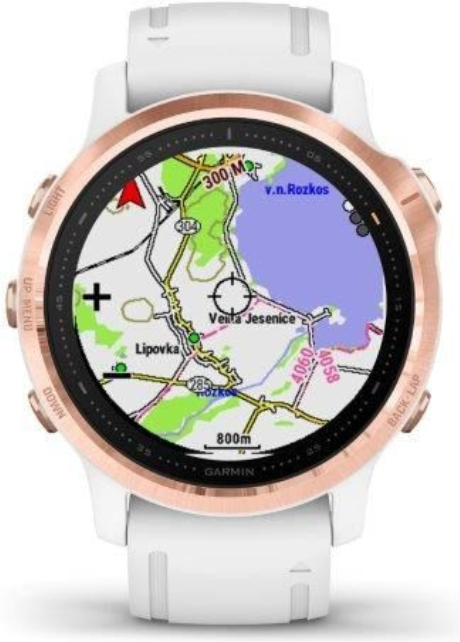 Garmin fenix6S Glass, RoseGold/White Band (MAP/Music) je model s nejmenší velikostí těla (Fénix6S) a displeje. Průměr displeje je 1,2“ (zůstává zachována stejná velikost jako u předchozí generace Fénix5S Plus). Hodinky jsou chráněné tvrzeným sklíčkem Gorilla Glass 3. Růžovozlatá luneta je vyrobena z ušlechtilé oceli. Hodinky mají bílý, měkký silikonový řemínek vhodný jak na sport, tak i na běžné nošení. Hodinky mají v paměti předinstalované mapy s možností automatické navigace, jsou vybavené WiFi konektivitou a nabízejí přehrávání hudby z vlastní paměti (32GB), do které je možné nahrát jak vlastní hudební soubory, tak i seznamy skladeb ze streamovacích hudebních služeb, jako je Spotify nebo Deezer. Vestavěný Li-Ion akumulátor nabízí extrémně dlouhou výdrž hodinek na 1 nabití: