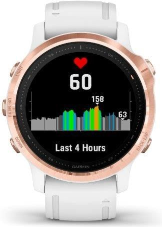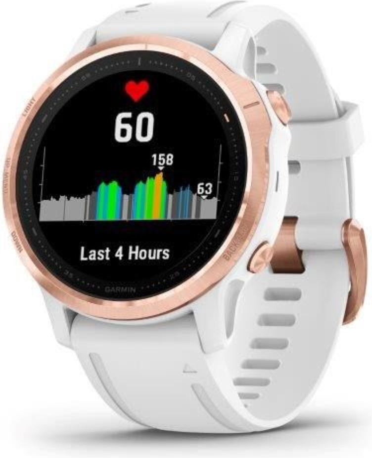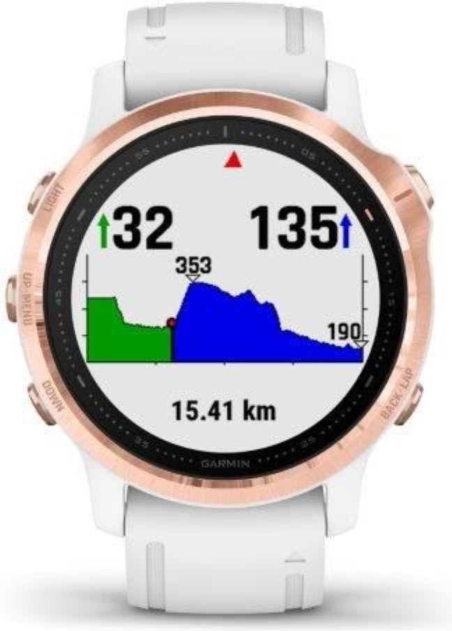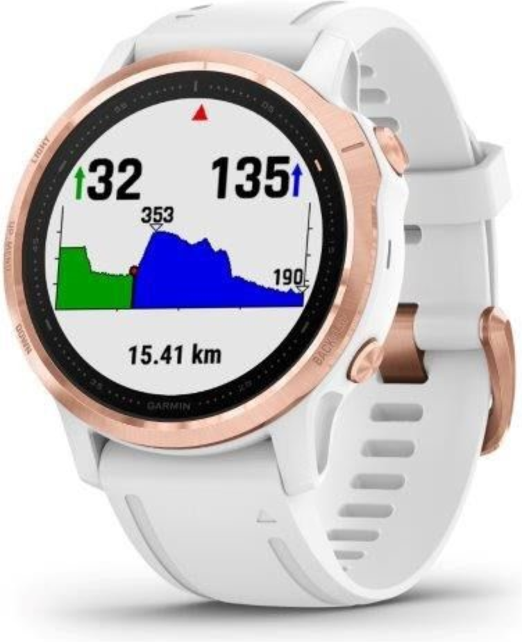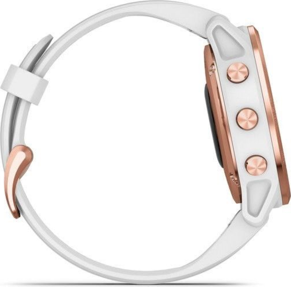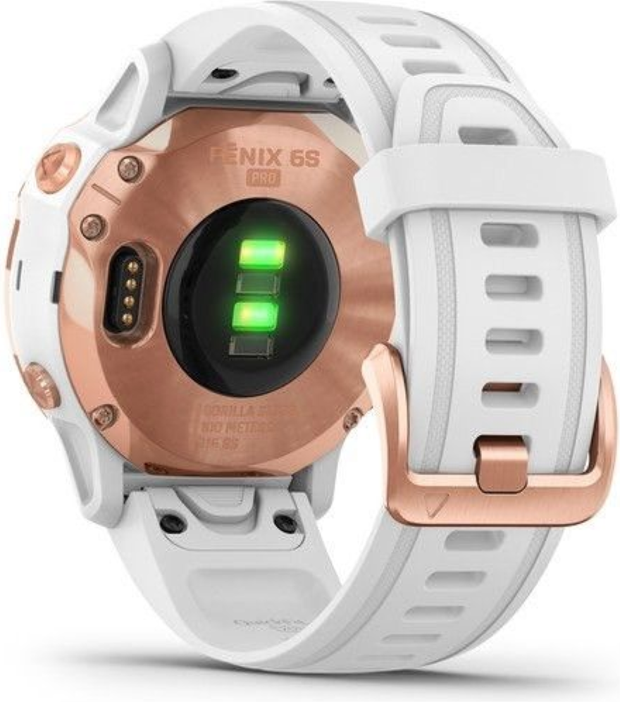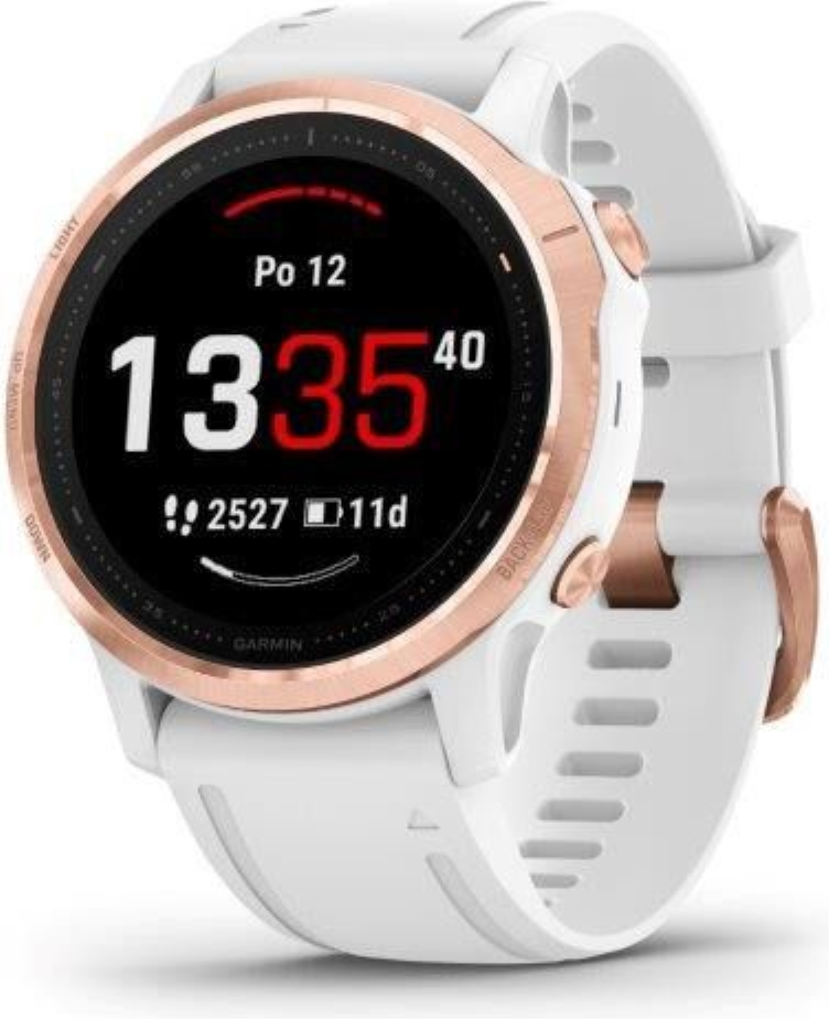 Garmin fenix6S Glass, RoseGold/White Band (MAP/Music) je model s nejmenší velikostí těla (Fénix6S) a displeje. Průměr displeje je 1,2“ (zůstává zachována stejná velikost jako u předchozí generace Fénix5S Plus). Hodinky jsou chráněné tvrzeným sklíčkem Gorilla Glass 3. Růžovozlatá luneta je vyrobena z ušlechtilé oceli. Hodinky mají bílý, měkký silikonový řemínek vhodný jak na sport, tak i na běžné nošení. Hodinky mají v paměti předinstalované mapy s možností automatické navigace, jsou vybavené WiFi konektivitou a nabízejí přehrávání hudby z vlastní paměti (32GB), do které je možné nahrát jak vlastní hudební soubory, tak i seznamy skladeb ze streamovacích hudebních služeb, jako je Spotify nebo Deezer. Vestavěný Li-Ion akumulátor nabízí extrémně dlouhou výdrž hodinek na 1 nabití: