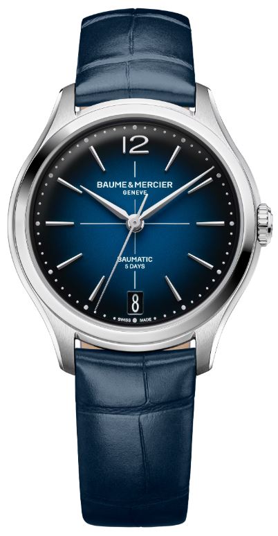 Model Clifton 10833 rozšiřuje kolekci o sofistikovaný 34mm formát v kulatém pouzdře ze saténově broušené nerezové oceli. Pouzdro doplňuje ocelová korunka a průhledné safírové dýnko, které umožňuje pohled na precizně zpracovaný mechanický strojek. Gradientní modrý lakovaný číselník s jemným přechodem odstínů lemuje bílá minutová stupnice s křížovým motivem (crosshair), která elegantně zvýrazňuje arabskou číslici na pozici 12. hodiny, nýtované lichoběžníkové