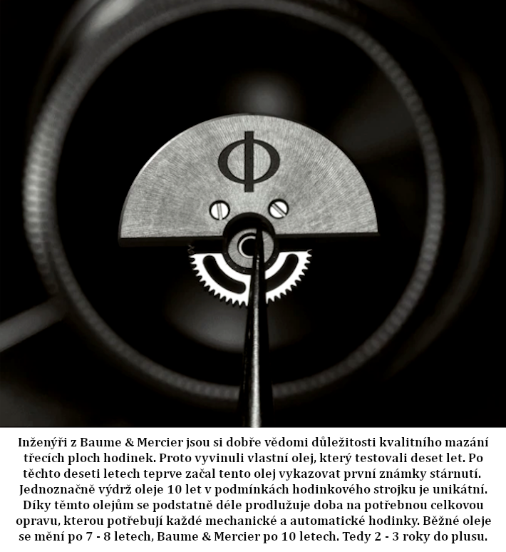 Inženýři z Baume & Mercier jsou si dobře vědomi důležitosti kvalitního mazání třecích ploch hodinek. Proto vyvinuli vlastní olej, který testovali deset let. Po těchto deseti letech teprve začal tento olej vykazovat první známky stárnutí. Jednoznačně výdrž oleje 10 let v podmínkách hodinkového strojku je unikátní. Díky těmto olejům se podstatně déle prodlužuje doba na potřebnou celkovou opravu, kterou potřebují každé mechanické a automatické hodinky. Běžné oleje se mění po 7 - 8 letech, Baume & Mercier po 10 letech. Tedy 2 - 3 roky do plusu.