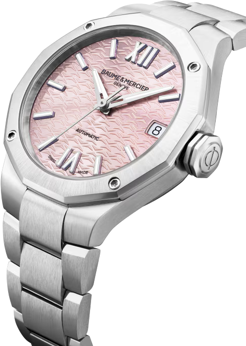 Tyto dámské hodinky Baume et Mercier Riviera M0A10675, poháněná „swiss made“ automatickým strojkem, je ozdobena růžovým ciferníkem a upevněna na kovovém náramku, který těmto hodinkám dodává lehký vzhled. Doporučeno pro asertivní povahy.