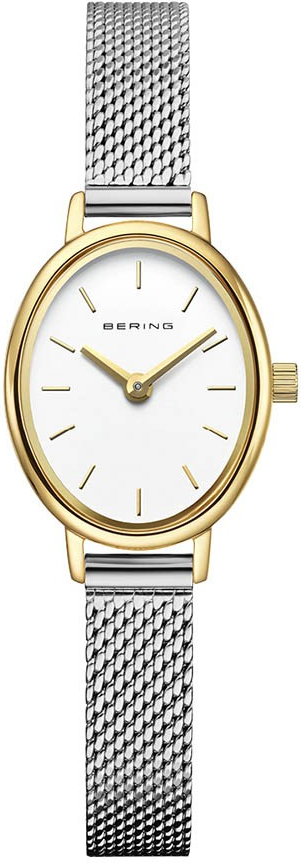 BERING Classic 11020-010 jsou dámské hodinky, které staví na čistém skandinávském minimalismu a jemném šperkovém dojmu. Oválné linie a kontrast zlatého pouzdra se stříbrným tahem působí elegantně, ale nepřeplácaně - ideální pro ženy, které chtějí doplněk do práce i na společenské příležitosti. Dominantou je bílý číselník s tenkými indexy a ručkami v ladícím tónu, díky kterým je čas čitelný na první pohled a design zůstává maximálně čistý.