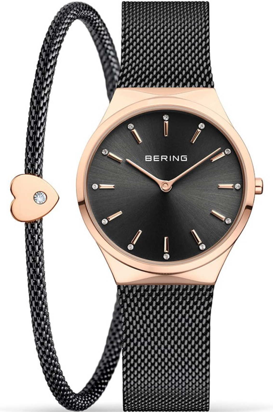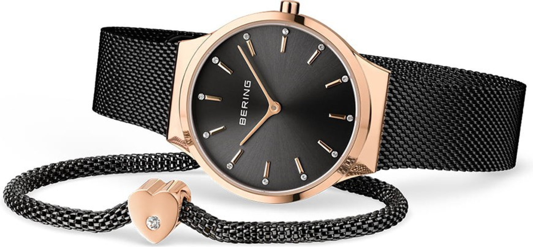 Hodinky 12131-169-GWP jsou dodávány v setu s pleteným náramkem Bering z ušlechtilé oceli, ozdobeným korálkem ve tvaru srdce v barvě růžového zlata se Swarovského krystalem. Délka náramku je 19 cm. Srdíčko na náramku je posuvné.