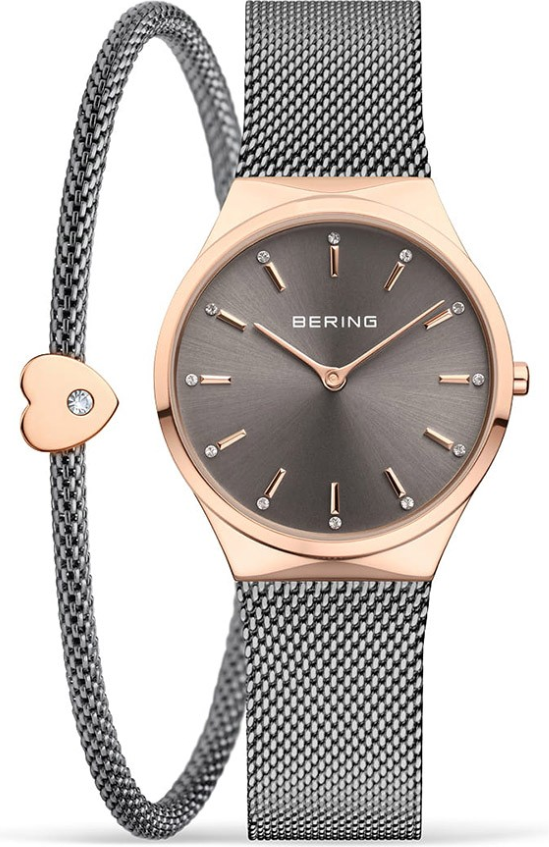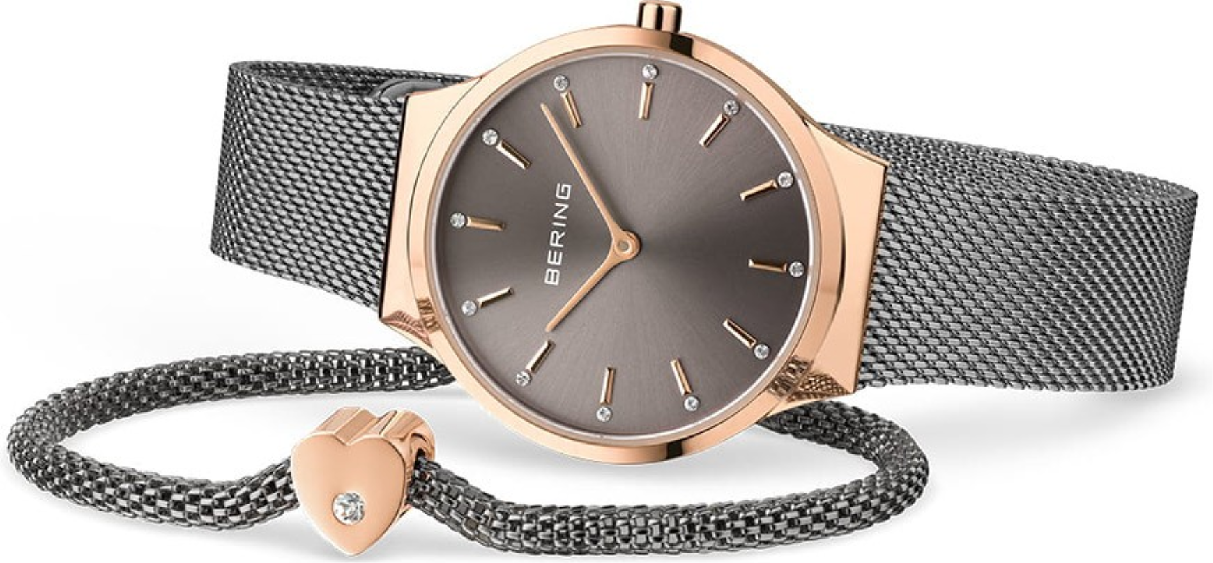 Hodinky 12131-369-GWP jsou dodávány v setu s pleteným náramkem Bering z ušlechtilé oceli, ozdobeným korálkem ve tvaru srdce v barvě růžového zlata se Swarovského krystalem. Délka náramku je 19 cm. Srdíčko na náramku je posuvné. Tento set byl vyroben ke Dni matek.