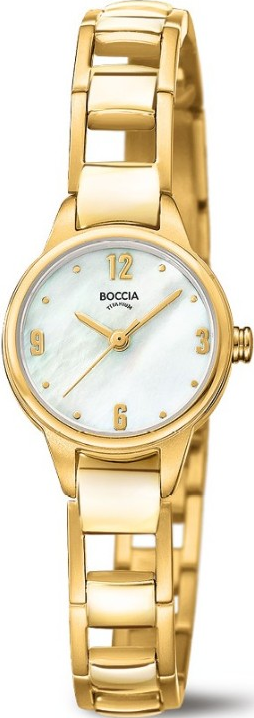 Boccia Titanium 3277-03 jsou dámské titanové hodinky, které cílí na čistou eleganci a šperkový dojem bez zbytečných rušivých prvků. Zlatý tón působí luxusně, přitom zůstává decentní, takže hodinky snadno sladíte s pracovním i společenským outfitem. Dominantou je bílý perleťový číselník, který mění odlesky podle světla a dodává modelu jemnost. Celkový design staví na minimalismu - žádná datumovka, jen čas čitelně a s grácií.