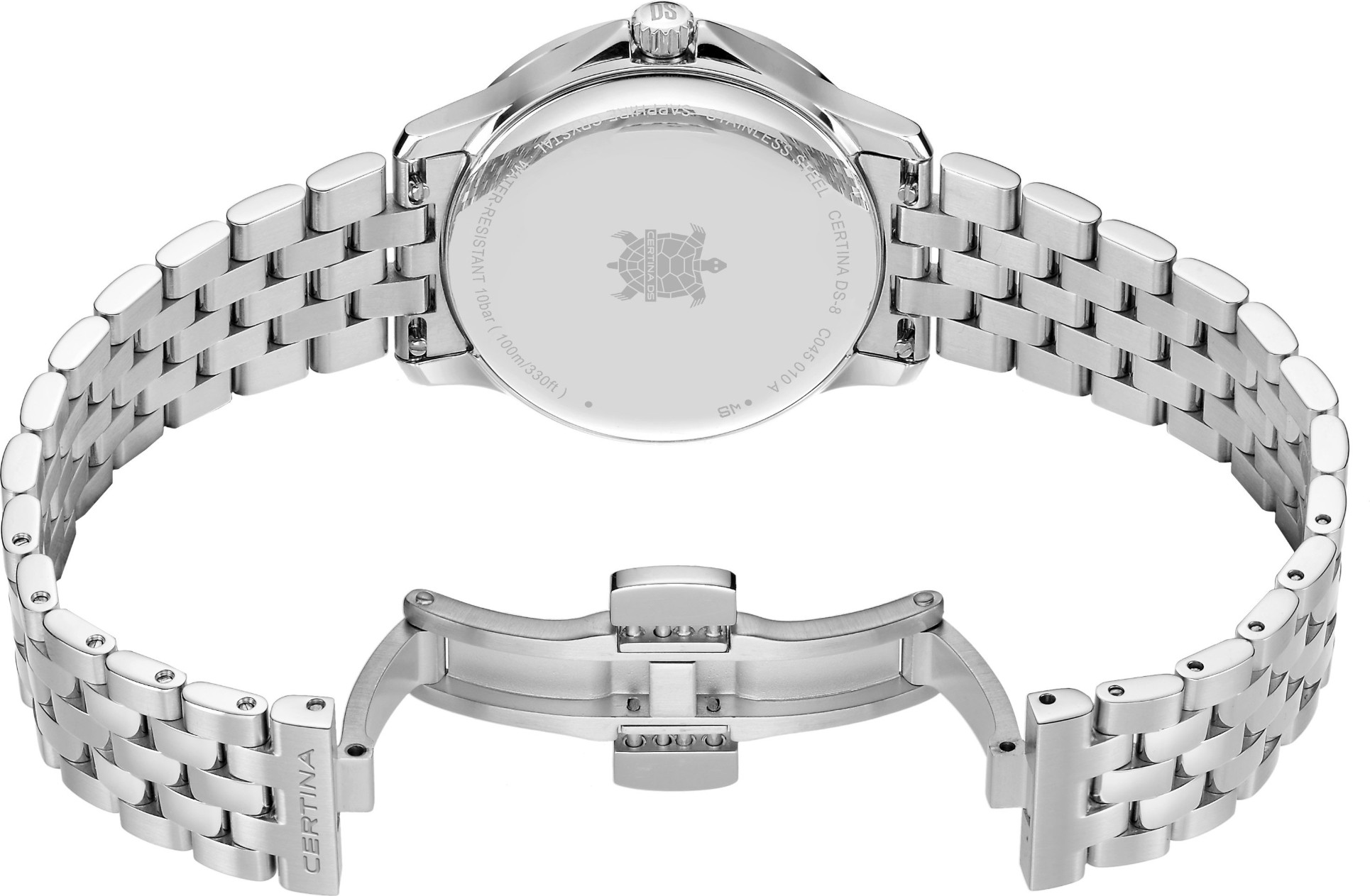 odolnost proti nárazům, abnormální tvrdost - díky tomu nenarušení povrchu ani při velké fyzické zátěži a nádherná čirá čistota, která zůstává po celou životnost sklíčka. Čtení času na hodinkách je poté radost - sklíčko je totiž stále jako nové. Safírová sklíčka se vyrábí v různých podobách a tvarech.Ušlechtilá nerez ocel 316L, kterou Certina používá, je mimořádně odolná,