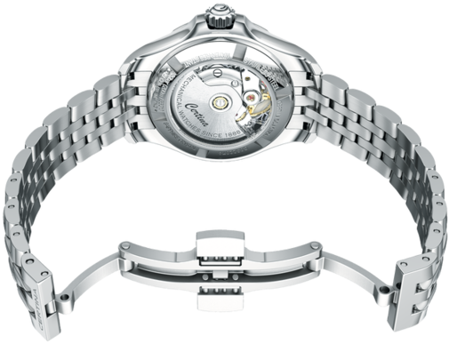 POwermatic 80 - automatický strojek s dvojnásobnou rezervou chodu oproti běžným modelům. Vysoká přesnost je zde dosažena velmi jemnou regulací šroubky setrvačce.Uzavřením hodinek šroubovací korunkou docílíme jednoho z nejlepších utěsnění pouzdra, které se v hodinářském průmyslu používá. Na obrázku můžeme vidět korunku ve vyšroubované poloze, ze které má poté korunka výsuvem směrem ven obvykle další dvě polohy na rychloposuv datumu a řízení času. Zatlačením korunky směrem k závitu a zašroubováním korunky k pouzdru již závit nevidíme - současně se zašroubováním korunky dotláčíme těsnění k pouzdru, čímž se hodinky až hermeticky uzavřou.Charakteristiky, kterými safírové sklo přispívá k hodinkám, jsou: extrémní