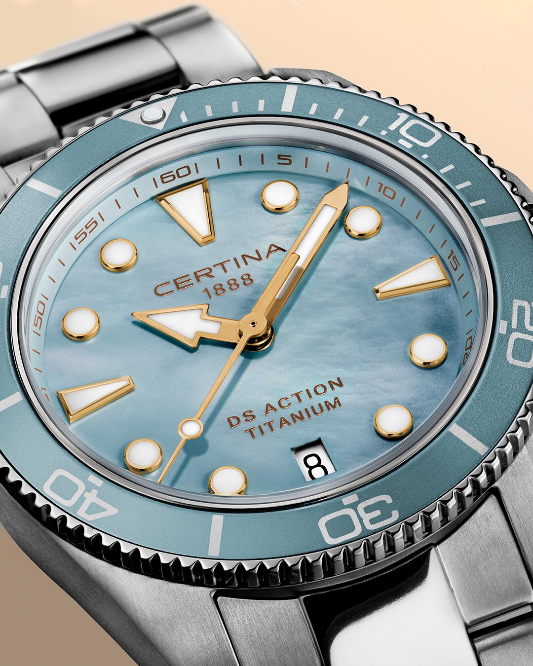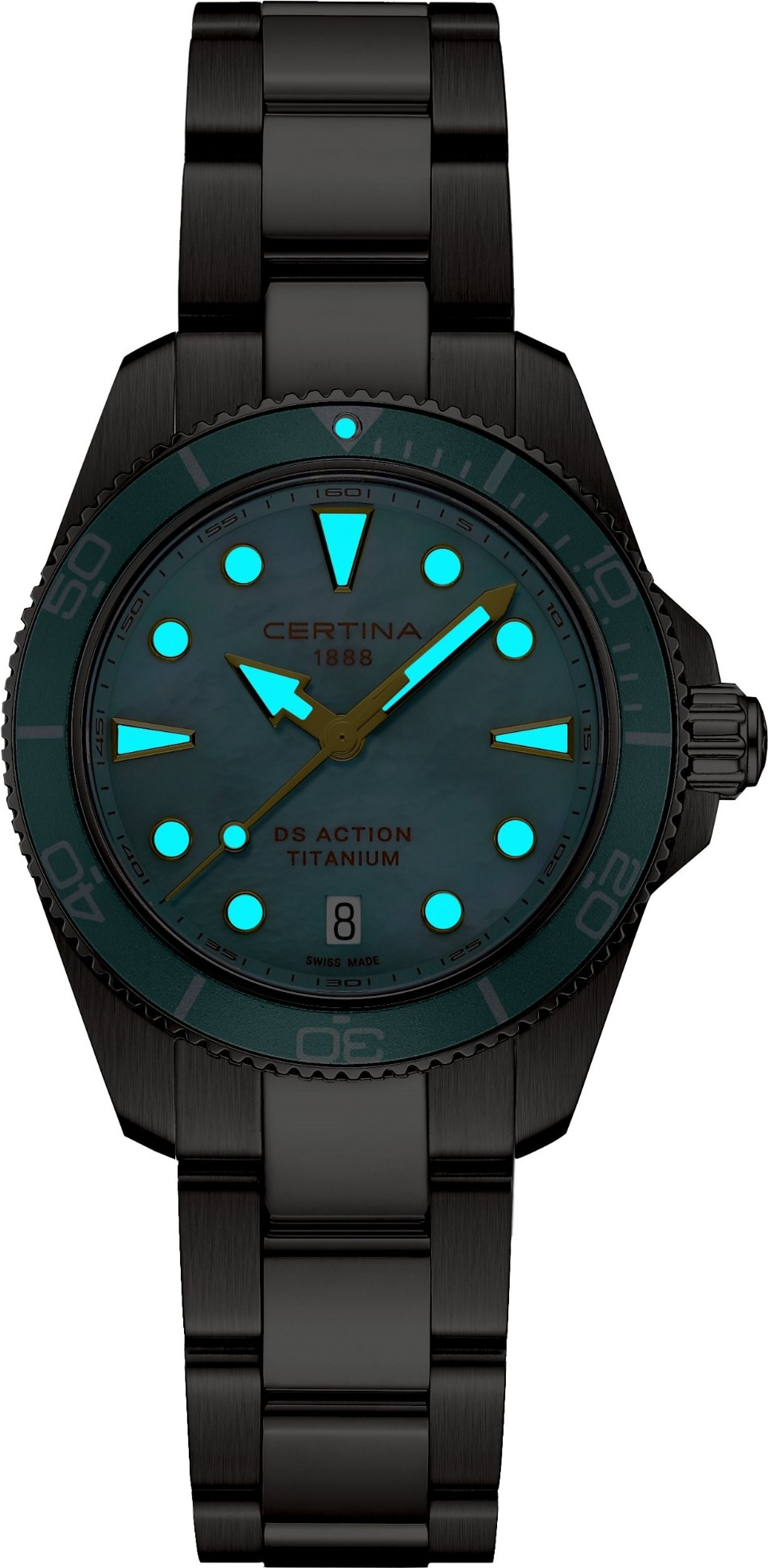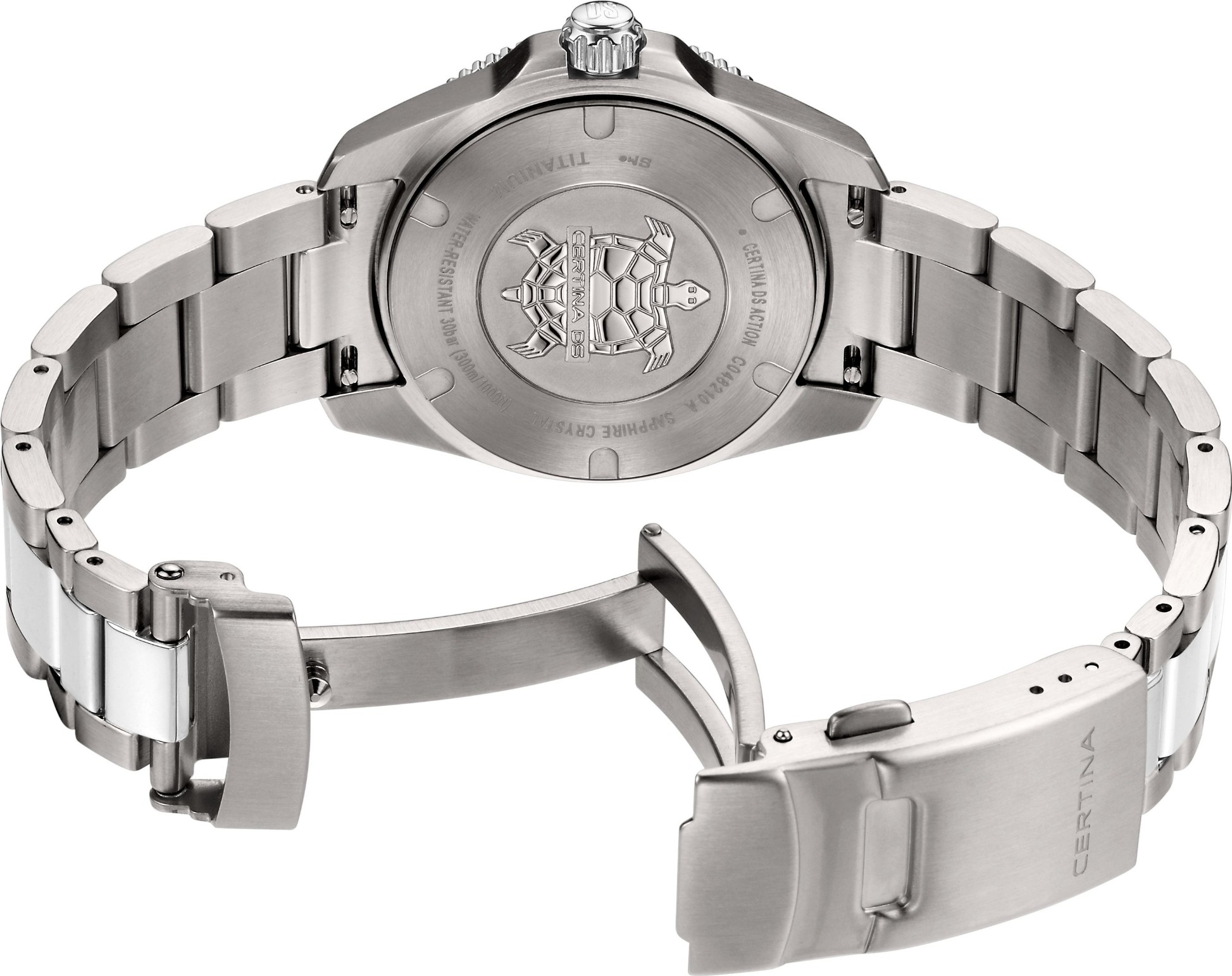 odolnost proti nárazům, abnormální tvrdost - díky tomu nenarušení povrchu ani při velké fyzické zátěži a nádherná čirá čistota, která zůstává po celou životnost sklíčka. Čtení času na hodinkách je poté radost - sklíčko je totiž stále jako nové. Safírová sklíčka se vyrábí v různých podobách a tvarech.Super-LumiNova (SLN) je luminiscenční materiál s vlastnostmi fosforu. Typ BG W9, který Certina používá, vydává ve tmě modravé světlo. Tato svítivost se ve tmě postupně ztrácí, ale na světle se automaticky obnovuje pro naplnění kapacity materiálů pro další noční či večerní svítivost.Titan (titanium) je kovový prvek, který je mimořádně odolný, 100% hypoalergenní a antikorozivý. Jeho další předností je neobyčejná lehkost - je přibližně o polovinu lehčí než ušlechtilá nerez ocel. Tento materiál má v matném provedení elegantní šedou barvu, v lesku je čistě stříbrný.