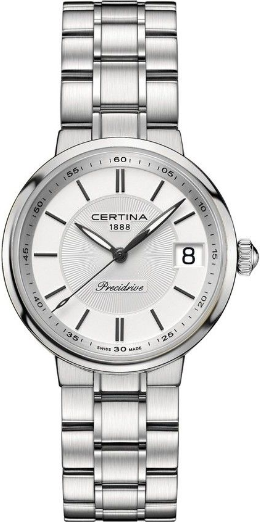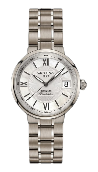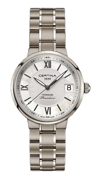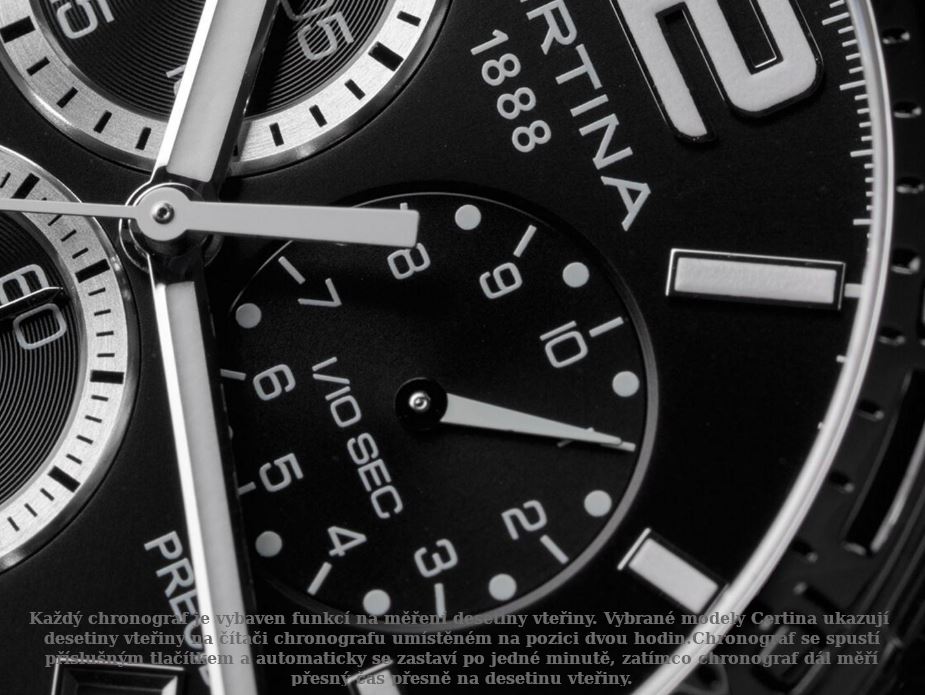 odolnost proti nárazům, abnormální tvrdost - díky tomu nenarušení povrchu ani při velké fyzické zátěži a nádherná čirá čistota, která zůstává po celou životnost sklíčka. Čtení času na hodinkách je poté radost - sklíčko je totiž stále jako nové. Safírová sklíčka se vyrábí v různých podobách a tvarech.Super-LumiNova (SLN) je luminiscenční materiál s vlastnostmi fosforu. Typ BG W9, který Certina používá, vydává ve tmě modravé světlo. Tato svítivost se ve tmě postupně ztrácí, ale na světle se automaticky obnovuje pro naplnění kapacity materiálů pro další noční či večerní svítivost.Přesný a ještě přesnější - to je chronometr. Chronometr jsou hodinky, jejichž přesnost byla oficiálně testována a ověřena nezávislou laboratoří. Tento model byl testován oficiální švýcarskou testovací laboratoří Control Officiel Suisse des Chronometres (COSC) a byl mu udělen certifikát kvalityTitan (titanium) je kovový prvek, který je mimořádně odolný, 100% hypoalergenní a antikorozivý. Jeho další předností je neobyčejná lehkost - je přibližně o polovinu lehčí než ušlechtilá nerez ocel. Tento materiál má v matném provedení elegantní šedou barvu, v lesku je čistě stříbrný.