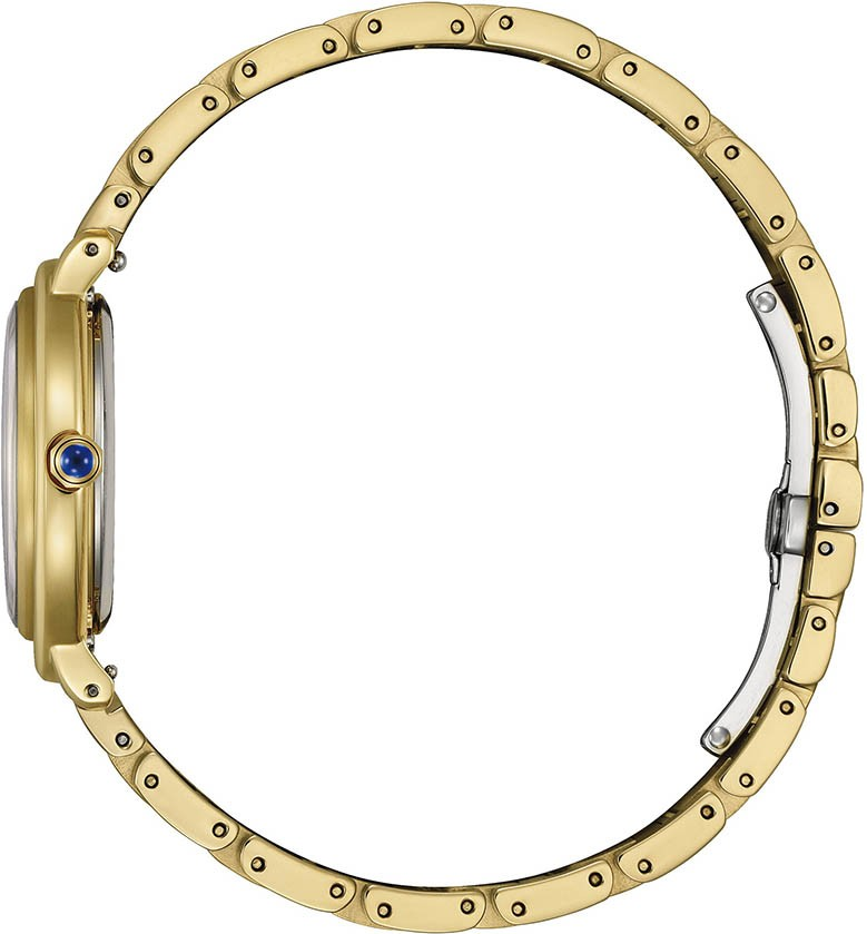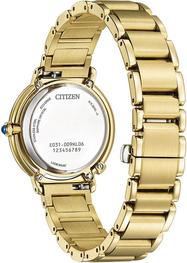 Citizen L Eco-Drive Limited Edition EM1099-57L představuje harmonii jemné dámské elegance a vyspělé technologie, která dokáže proměnit obyčejný moment v nadčasový detail. Pozlacené pouzdro z nerezové oceli o průměru 31,2 mm působí jako šperk samo o sobě, doplněné třemi třpytivými diamanty, jež zvýrazňují hluboký modrý číselník a dodávají mu kultivovanou jiskru. Safírové sklo