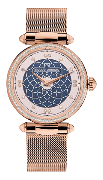 Dámské quartzové hodinky z chirurgické oceli s PVD potahem v barvě růžového zlata. Na modrém číselníku je světoznámé zobrazení tzv. "květ života", ručky jsou v barvě růžového zlata, ocelový náramek s PVD potahem je také v barvě růžového zlata.