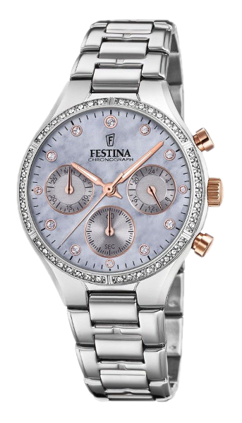 • Funkce a popis:Čas, 24 hodinový číselník, chronograf = stopky, svítící ručky a indexy, číselník a lunetu zdobí Swarovski krystaly
