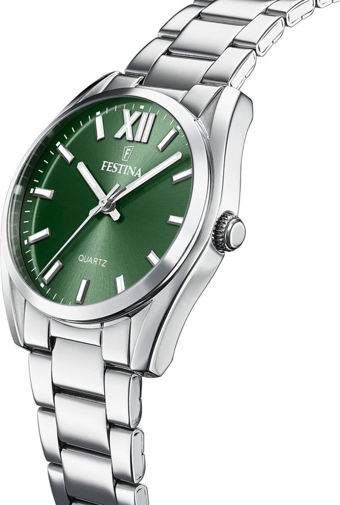 Festina Boyfriend Collection 20622/4 jsou dámské hodinky Festina pro ženy, které chtějí moderní vzhled s jistotou ocelového zpracování. Kolekce Boyfriend je postavená na větším průměru, takže na ruce působí sebevědomě, ale stále elegantně. Tento model je provedený jako analogové dámské hodinky na ocelovém tahu a hlavní roli hraje tmavě zelený číselník, který zaujme na první pohled a přitom zůstává snadno kombinovatelný.