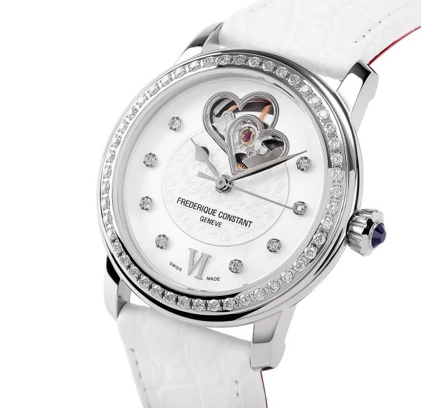 • Funkce a popis:Čas, strojek FC-310 (použit strojek Sellita SW-200), 26 kamenů - rezerva chodu 38 hodin, kmity setrvačky 28.800/h = diference 3 - 4 vteřiny denně, číselník zdobí 8 diamantů o váze 0,08 karátů a lunetu 48 diamantů, otevřené srdce, průhledné zadní víčko pro náhled na strojek, překlápěcí spona pásku (motýlková)