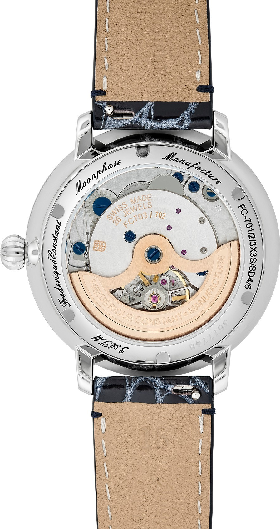 • Funkce a popis:Čas, ručičkový datum, měsíční fáze, svítící ručky a indexy, automatický strojek Swiss (in-house - vlastní výroba) FC-702 - 26 kamenů - rezerva chodu 38 hodin, polokmity setrvačky 28.800/h = diference 2 - 4 vteřiny denně, průhledné zadní víčko pro náhled na strojek
