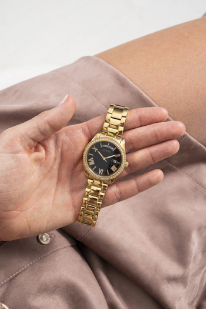 • Funkce a popis:Čas, datum, den v týdnu, lunetu zdobí zirkony