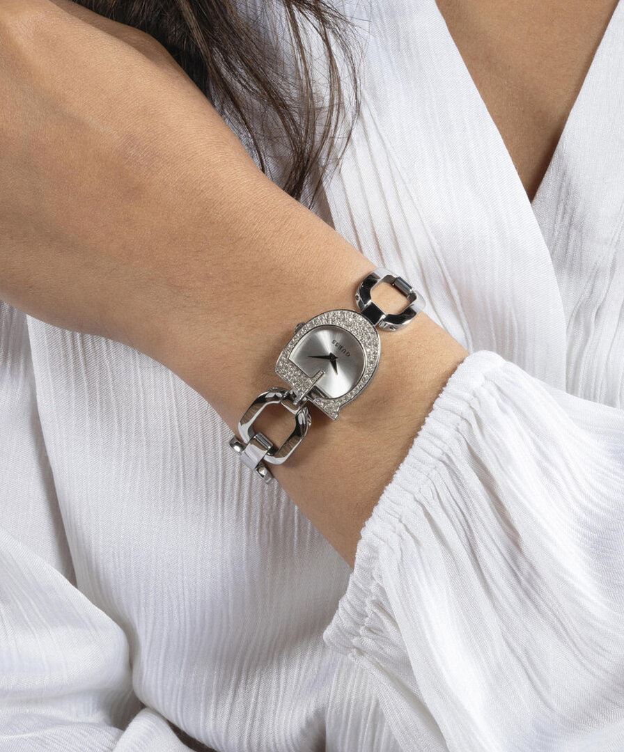 • Funkce a popis:Čas, strojek quartz = přesnost chodu do 0,5 vteřiny denně, pouzdro ve tvaru písmene G je zdobené zirkony
