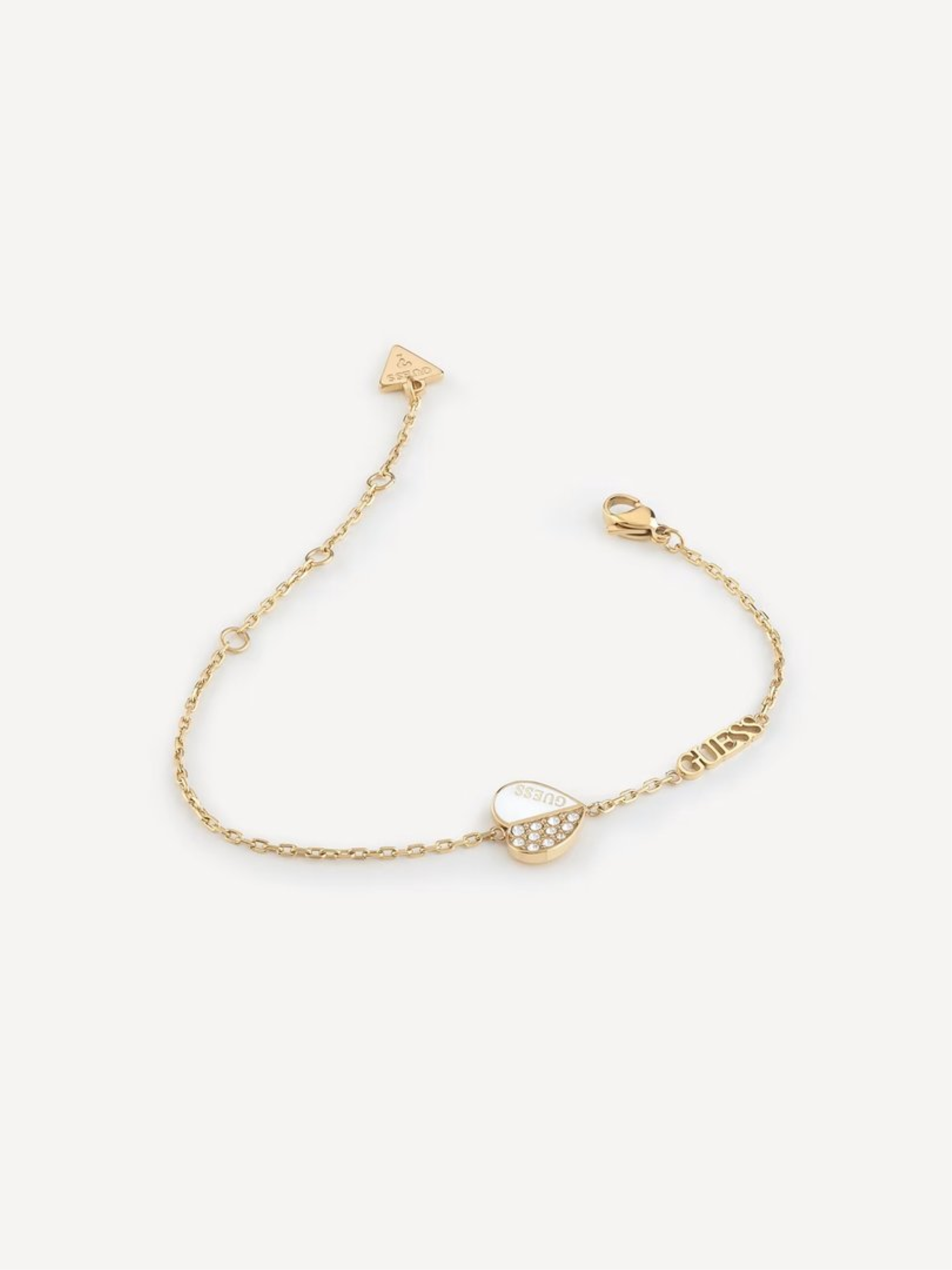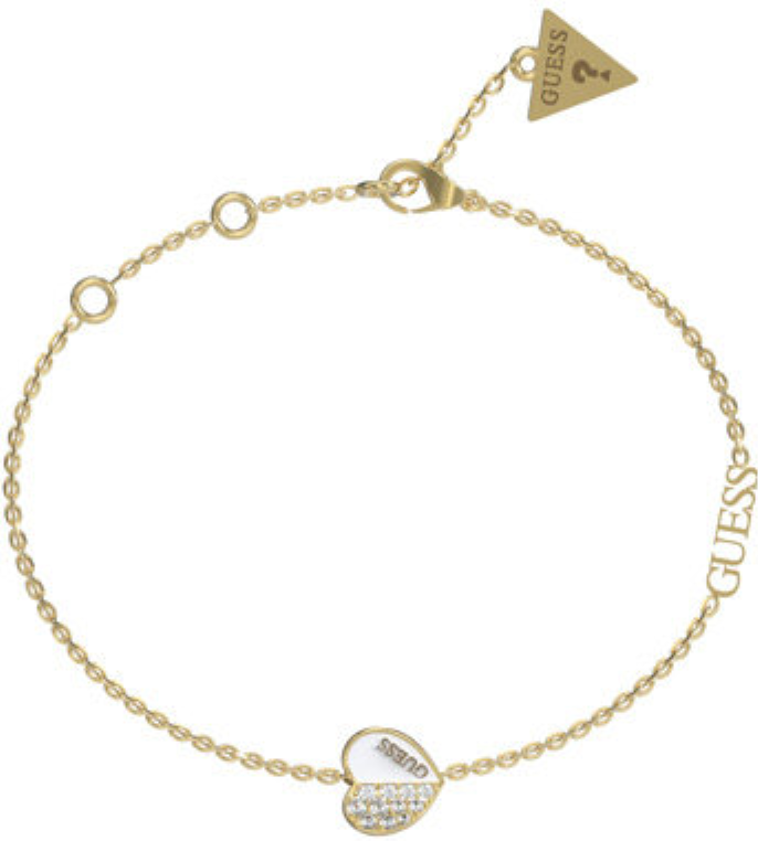 Náramek z nerezové oceli s přívěškem ve tvaru srdce se zirkonovými krystaly. Gravírované logo Guess na přívěšku. Logo Guess na náramku. Zapínání na karabinku.