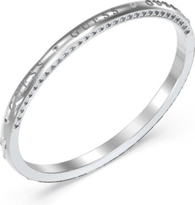 Náramek z nerezové oceli. Logo Guess a zirkony. Zapínání na klips. Průměr náramku: 5,5 x 4,5 cm. Šířka náramku: 0,5 cm.