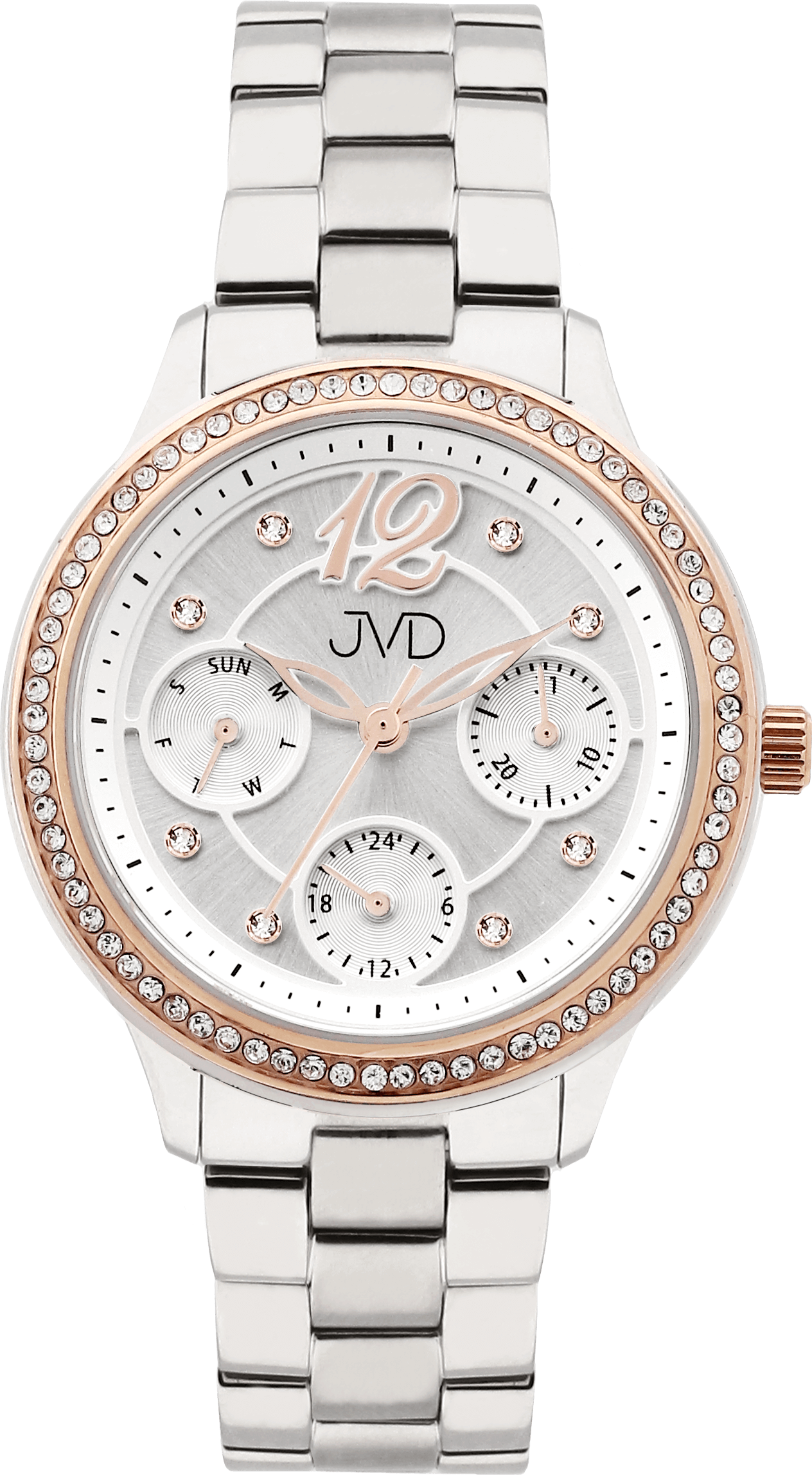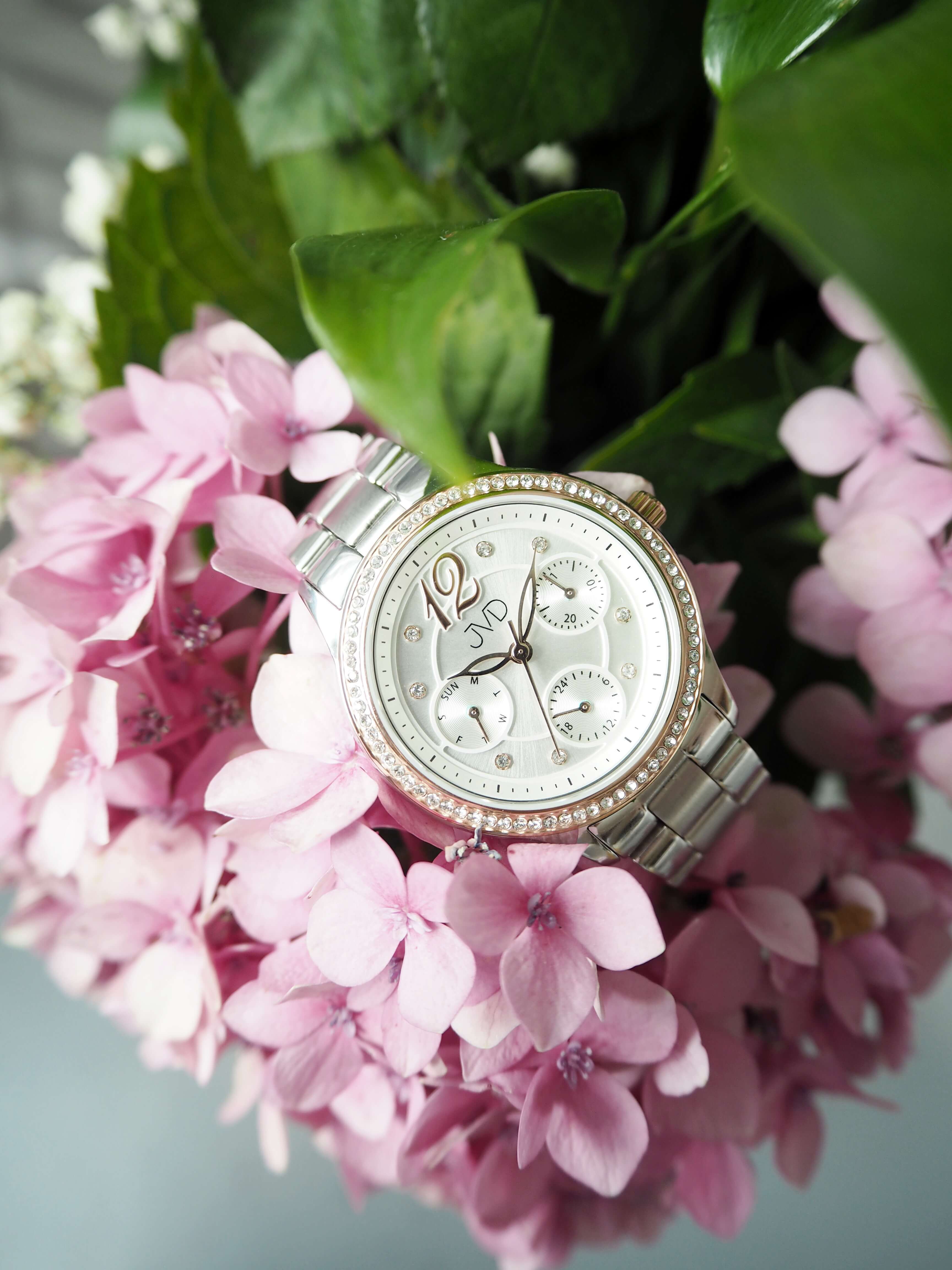 • Funkce a popis:Čas, datum, den v týdnu, režim 12/24, lunetu i číselník zdobí skleněné kamínky, Japonský strojek – Miyota