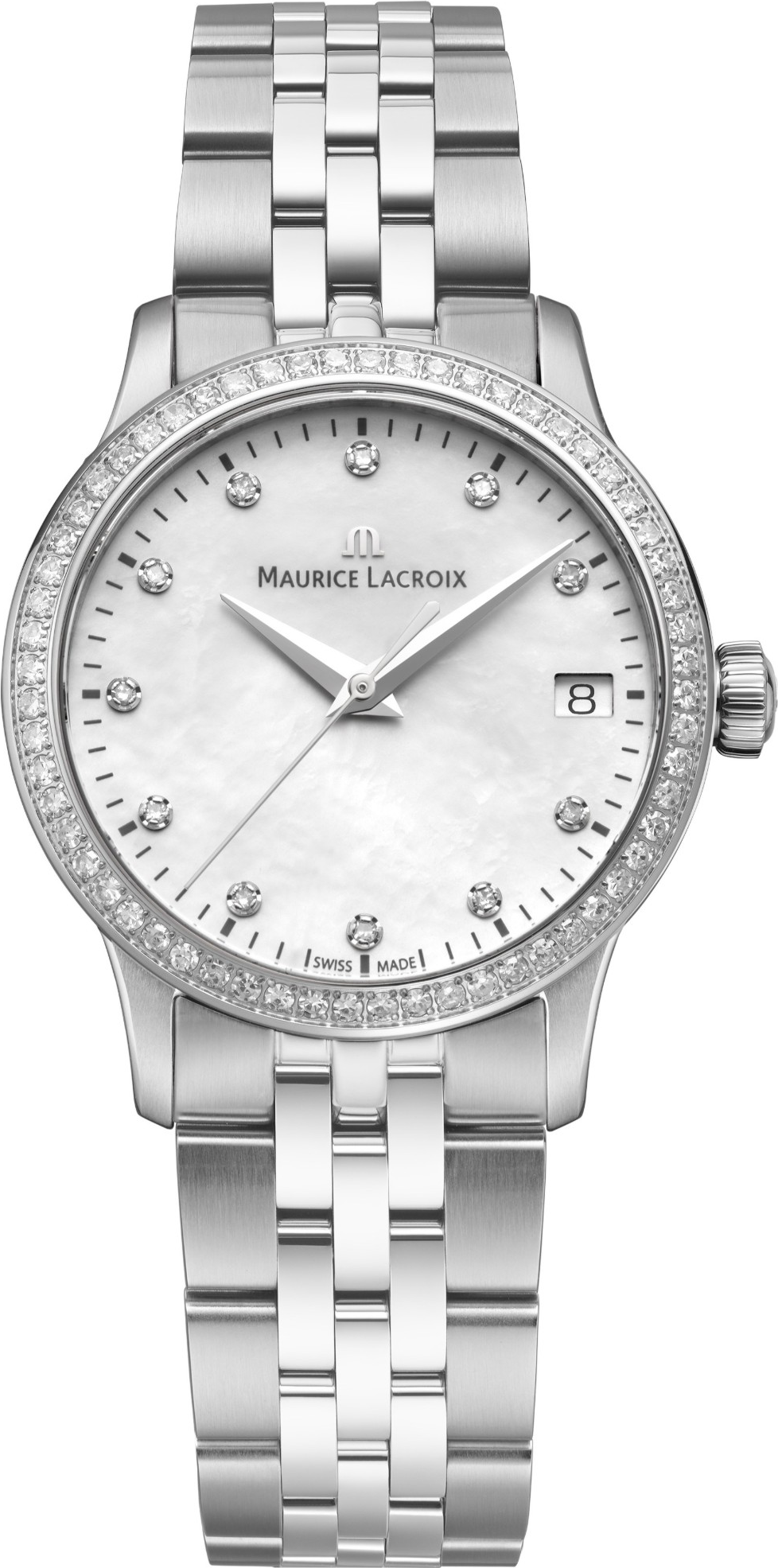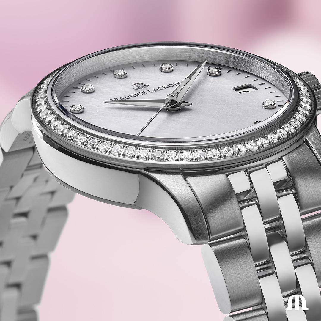 Maurice Lacroix 1975 Quartz 33mm 751006-SD502-170-1 jsou dámské švýcarské hodinky, které spojují uhlazenou eleganci s luxusním šperkařským detailem. Kolekce 1975 staví na čistých proporcích a vintage atmosféře, díky čemuž působí nadčasově i po letech. Na první pohled zaujme jemně třpytivý bílý perleťový číselník, který mění odlesky podle dopadu světla a dodává hodinkám sofistikovaný výraz. Praktické datum na pozici 3 hodin drží funkčnost na každodenní úrovni, aniž ...