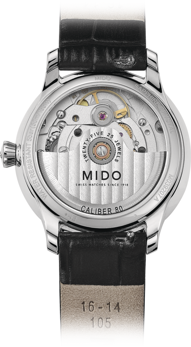 Automatický strojek Mido Caliber 80 je strojek nové generace, postaven však na léty vyzkoušeném strojku ETA 2824. Máme zde tedy vyzkoušenou mechaniku vylepšenou o podstatně delší rezervu chodu a to až dvojnásobek oproti běžným strojkům. Tento strojek dává hodinkám komfort v podobě 80 hodinové rezervy chodu, což v praxi znamená až třídenní chod hodinek odložených v klidu. Vysoká přesnost strojku je zde docílena regulací šroubky na věnci setrvačky.Strojky s automatickým nátahem značky Mido splňují ty nejpřísnější kritéria oboru