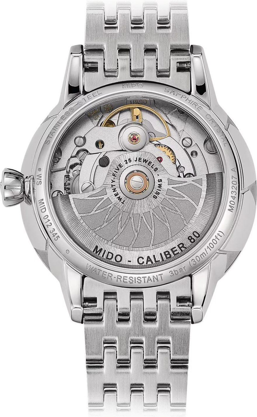 • Funkce a popis:Čas, datum, strojek swiss Mido caliber 80 (základ ETA C07.611) - vyráběn firmou Eta exklusivně pro Mido = 25 kamenů (krokové ústrojí ocel/kámen), rezerva chodu 80 hodin, polokmity setrvačky 21.600/h = přesnost chodu 3 - 5 vteřin denně (nižší polokmity setrvačky jsou vyladěny jemnou regulací na věnci setrvačky pro maximální přesnost strojku), ozdobně lapovaný rotor samonátahu, automatický nátah (pohyb ruky) + ruční nátah (hodinky lze také natahovat i korunkou), průhledné zadní víčko pro náhled na strojek