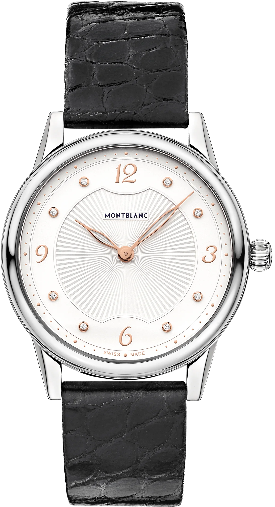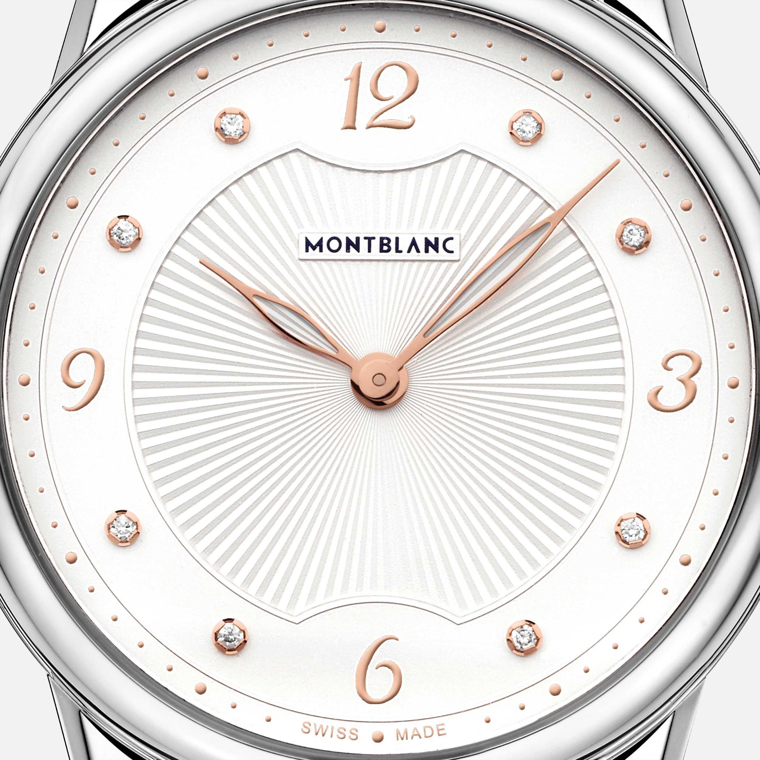 • Funkce a popis:Čas, strojek Swiss Montblanc calibre MB 21.17 - přesnost chodu 0 - 0,5 vteřiny denně, 3 maneové uložení strojek je složen s 31 součástek, stříbrný-bílý gilošový číselník osazen 8 diamanty (~ 0,046 CT), růžovým zlatem potažené arabské číslice