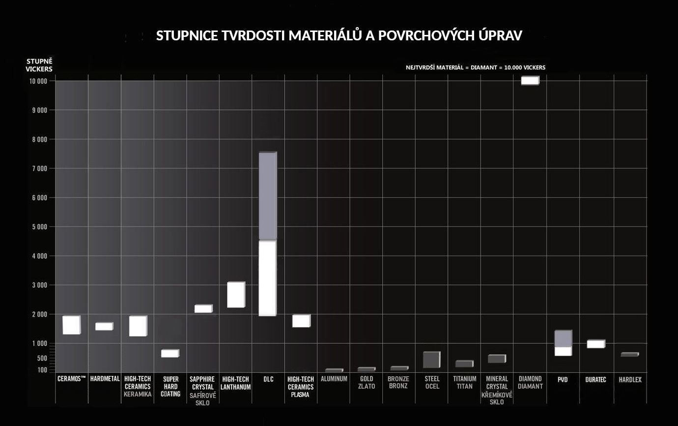V tabulce tvrdosti materiálů máme ale i povrchové úpravy kovů. V dnešní době existují již natolik pokročilé technologie, že není problém nanášet na kovy povrchové úpravy podstatně tvrdší než základní kov samotný. Jednou z nejznámějších povrchových úprav v hodinářském odvětví velmi často používanou je PVD. Hned na druhém místě co se týče tvrdosti je Super Hard Coating, kterou používá firma Seiko. Ještě o něco tvrdší povrchovou úpravu používá Citizen - ta nazývá se Duratec. A jedna z nejtvrdších povrchových úprav je systém DLC (Diamond Like Carbon), který má ovšem široké rozpětí tvrdosti, dle technologického postupu výroby tohoto povlaku. Obecně ale lze říci, že v hodinářském průmyslu se nejčastěji používá DLC ve tvrdosti kolem 1.800 Vickers.