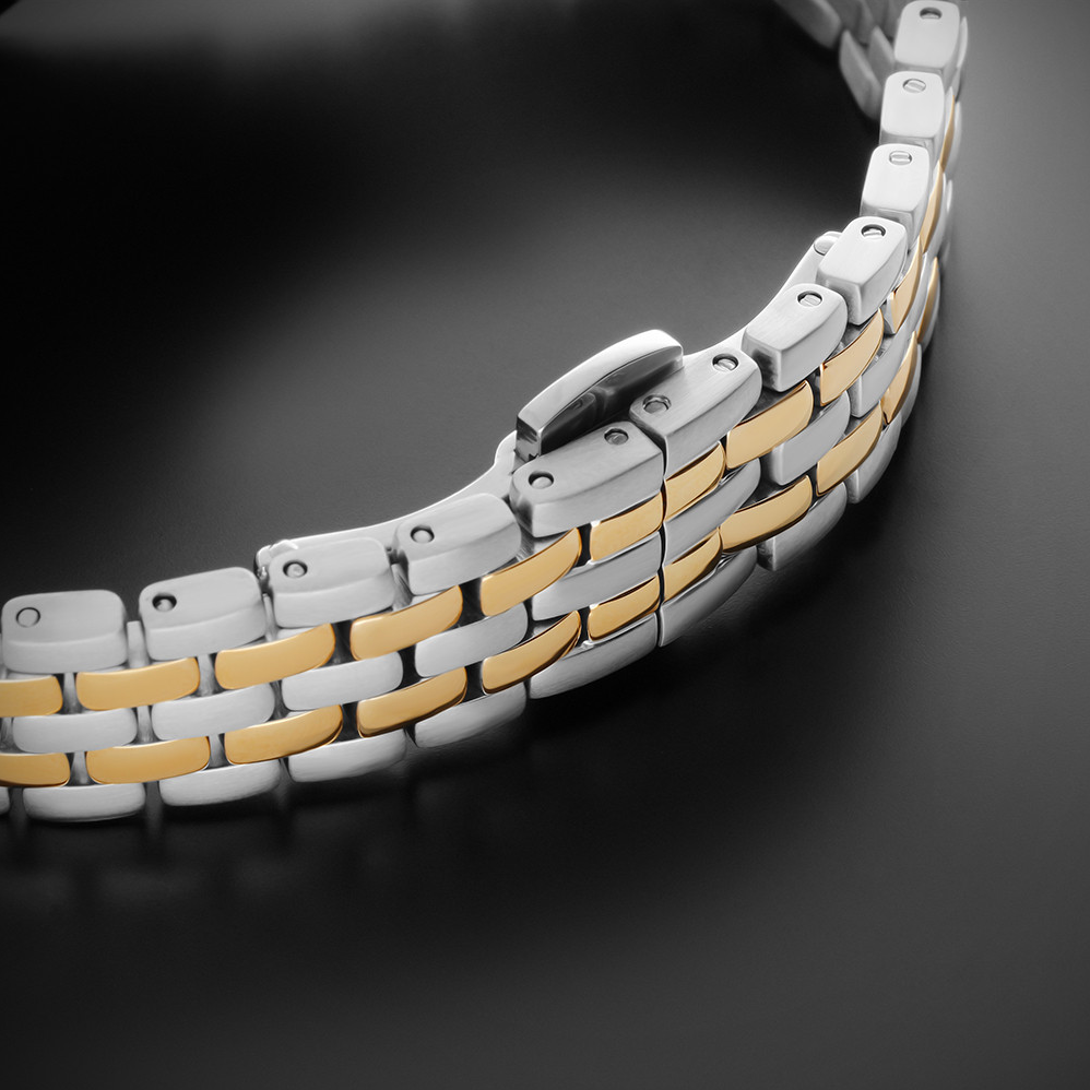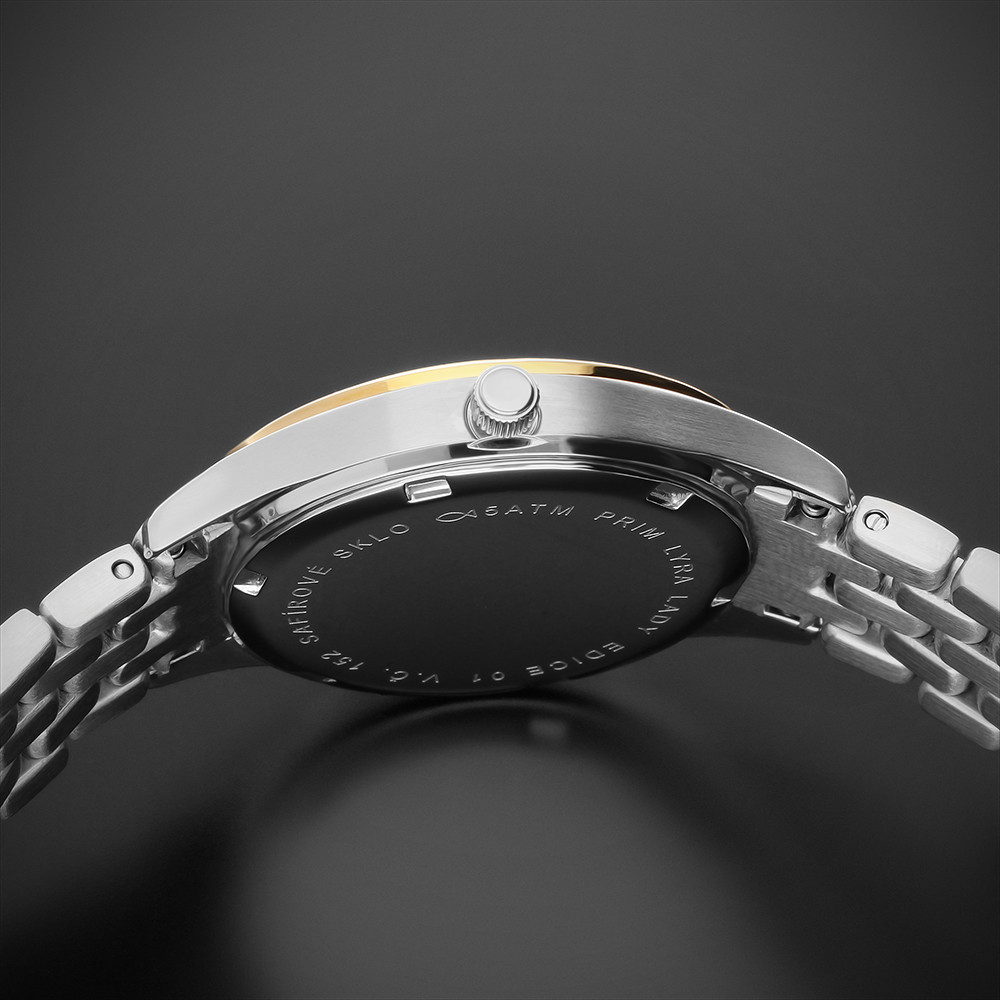 Dámské společenské hodinky PRIM Lyra jsou vyrobeny z ušlechtilé oceli 316L v kombinaci brusu a lesku. Voděodolnost 5 ATM zaručuje odolnost proti vodě při běžném používání.