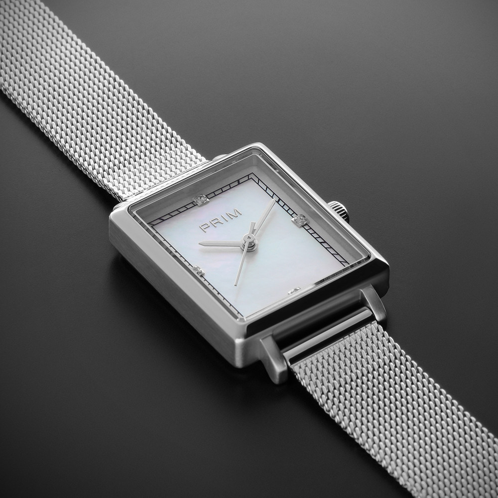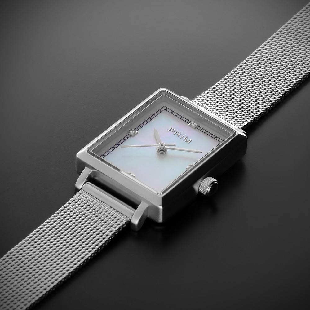 Luxusní dámské hodinky PRIM Aria Lady Diamond vyrobené z ušlechtilé oceli mají perleťový číselník, na kterém se třpytí 4 pravé diamanty (1.1 mm SI1). Hodinky PRIM Aria Lady Diamond jsou vhodné jak do společnosti, tak i na každodenní nošení do kanceláře. Voděodolnost 5 ATM zaručuje odolnost proti vodě při běžném používání. Safírové sklo s antitouch a antireflektivní vrstvou je u tohoto dámského modelu samozřejmostí.