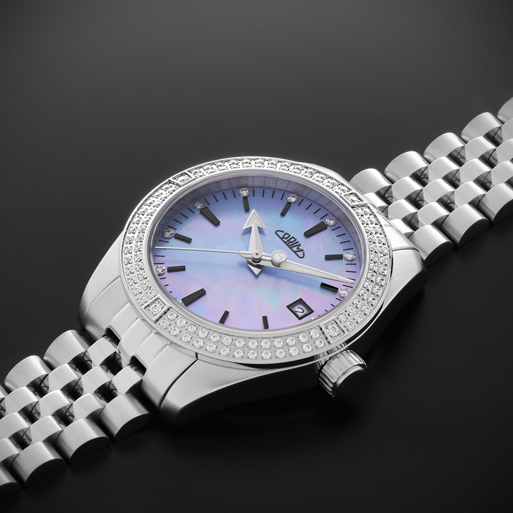• Funkce a popis:Čas, datum, automatický japonský strojek Miyota 8315, 21 kamenů, rezerva chodu až 60 hodin, polokmity setrvačky 21.600/h (3 Hz) = přesnost chodu (diference) 3 - 5 vteřin denně, pouzdro doplňuje 112 kusů CNC fasovaných krystalů cubic zirconia