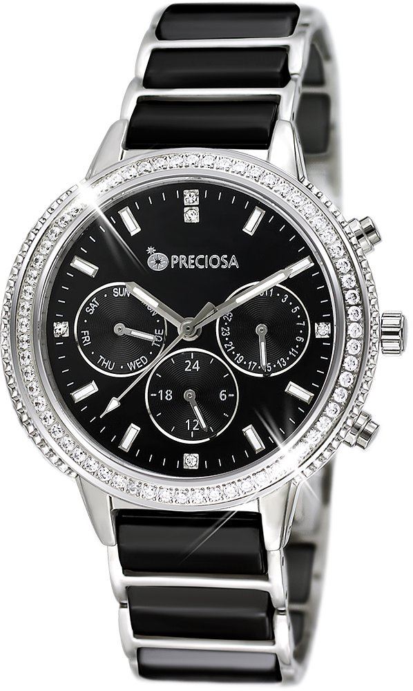 • Funkce a popis:Čas, datum, den v týdnu, režim 12/24, svítící ručky, číselník a lunetu zdobí zirkony